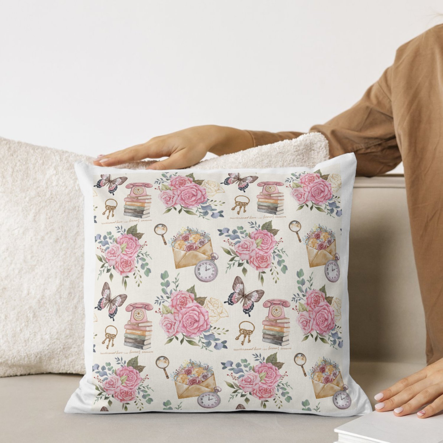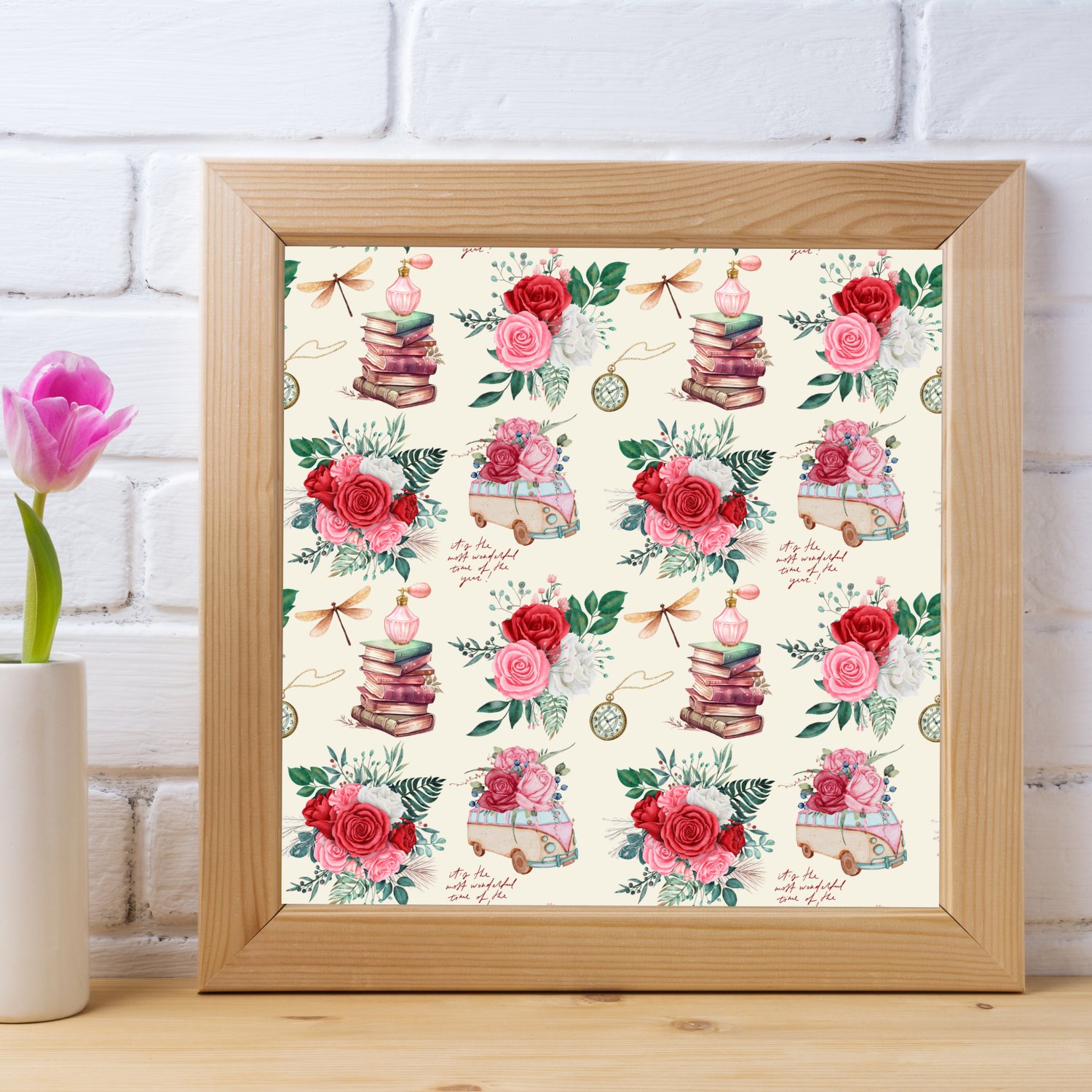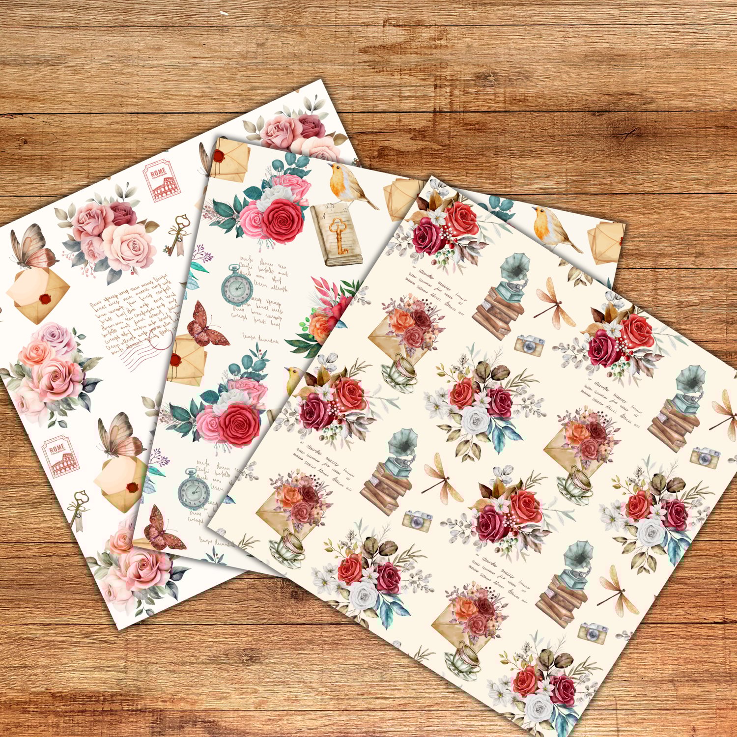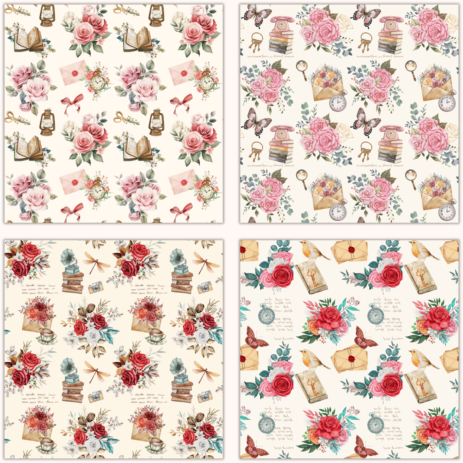 Bring timeless charm to your creative projects with this enchanting collection of 10 seamless watercolor patterns featuring delicate rose bouquets paired with vintage-inspired treasures. From whimsical envelopes and handwritten letters to charming cameras, lanterns, books, and fluttering butterflies, each design is rich in nostalgic detail and painted in soft, romantic watercolor tones. Perfect for adding a touch of elegance and vintage flair to stationery, scrapbooking, fabric design, and more.