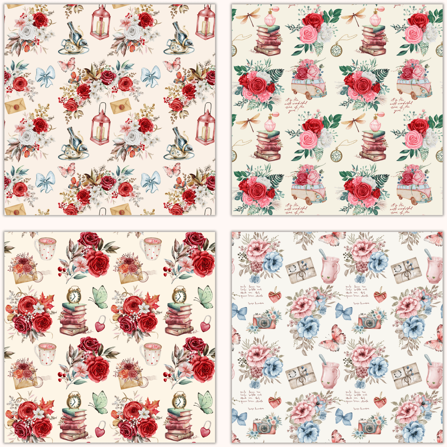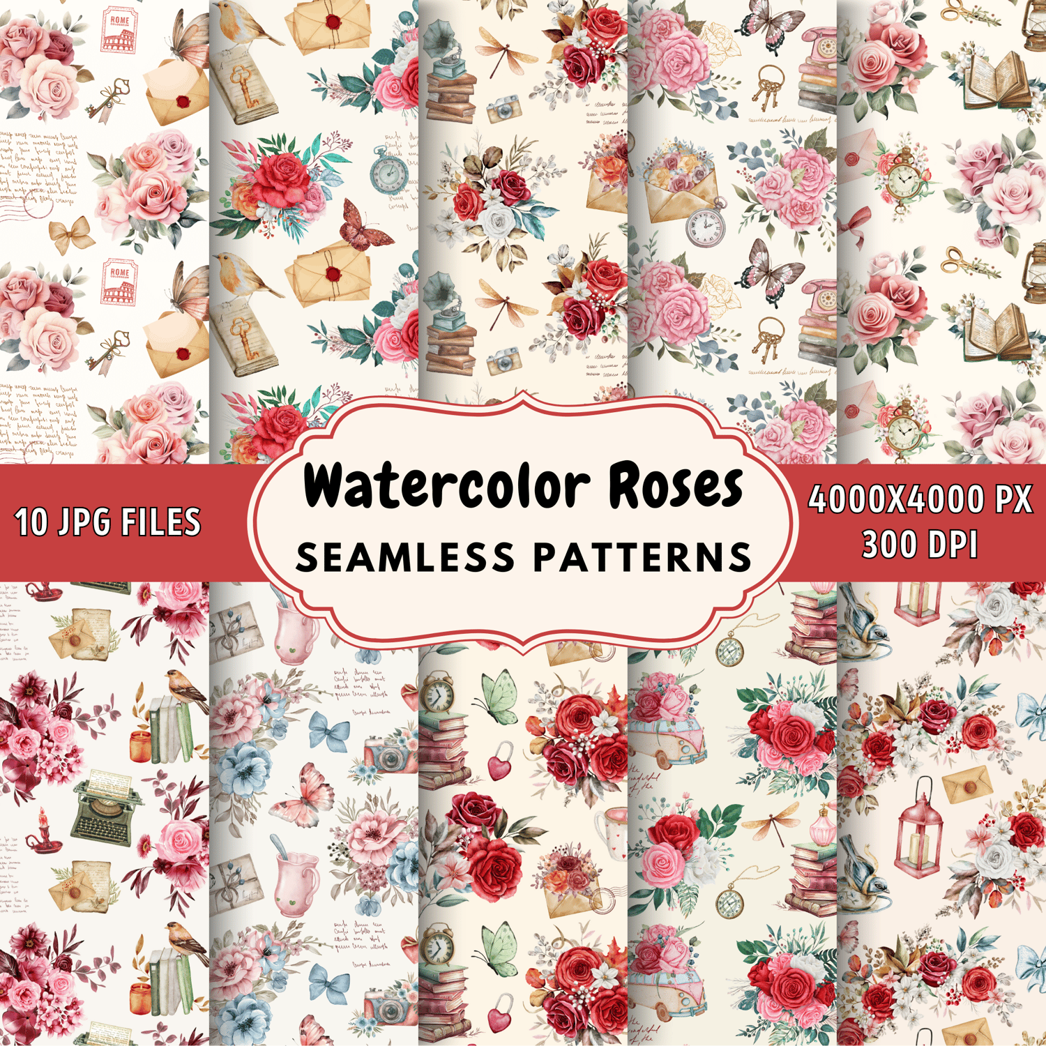 Watercolor Roses & Vintage Elements – 10 Seamless Patterns