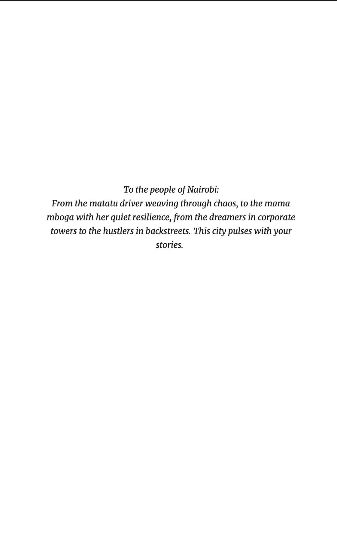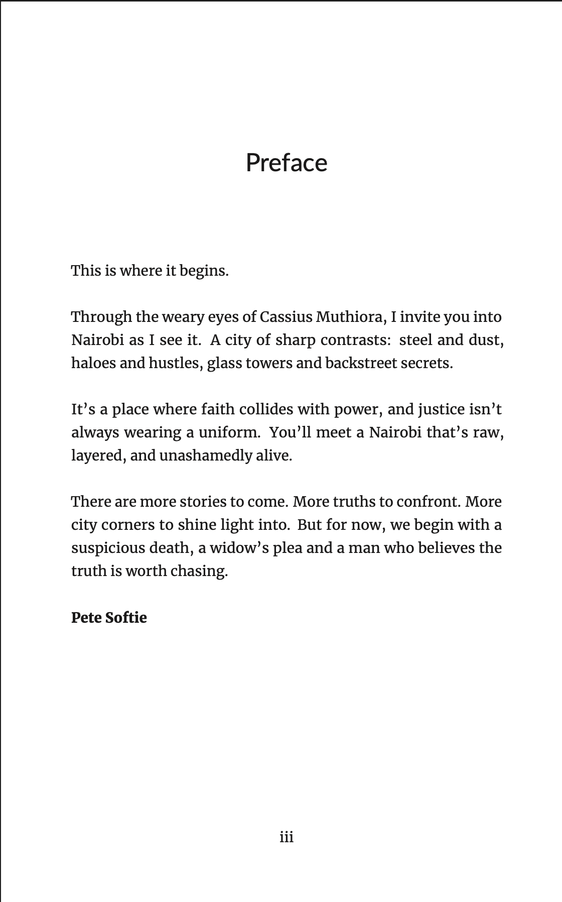 With Jonte, his Gen Z sidekick, a God Papa hat, and a conscience too stubborn to rest, Cassius Muthiora must navigate Nairobi’s underbelly of glass towers, back-alley fixers, and power-hungry syndicates.