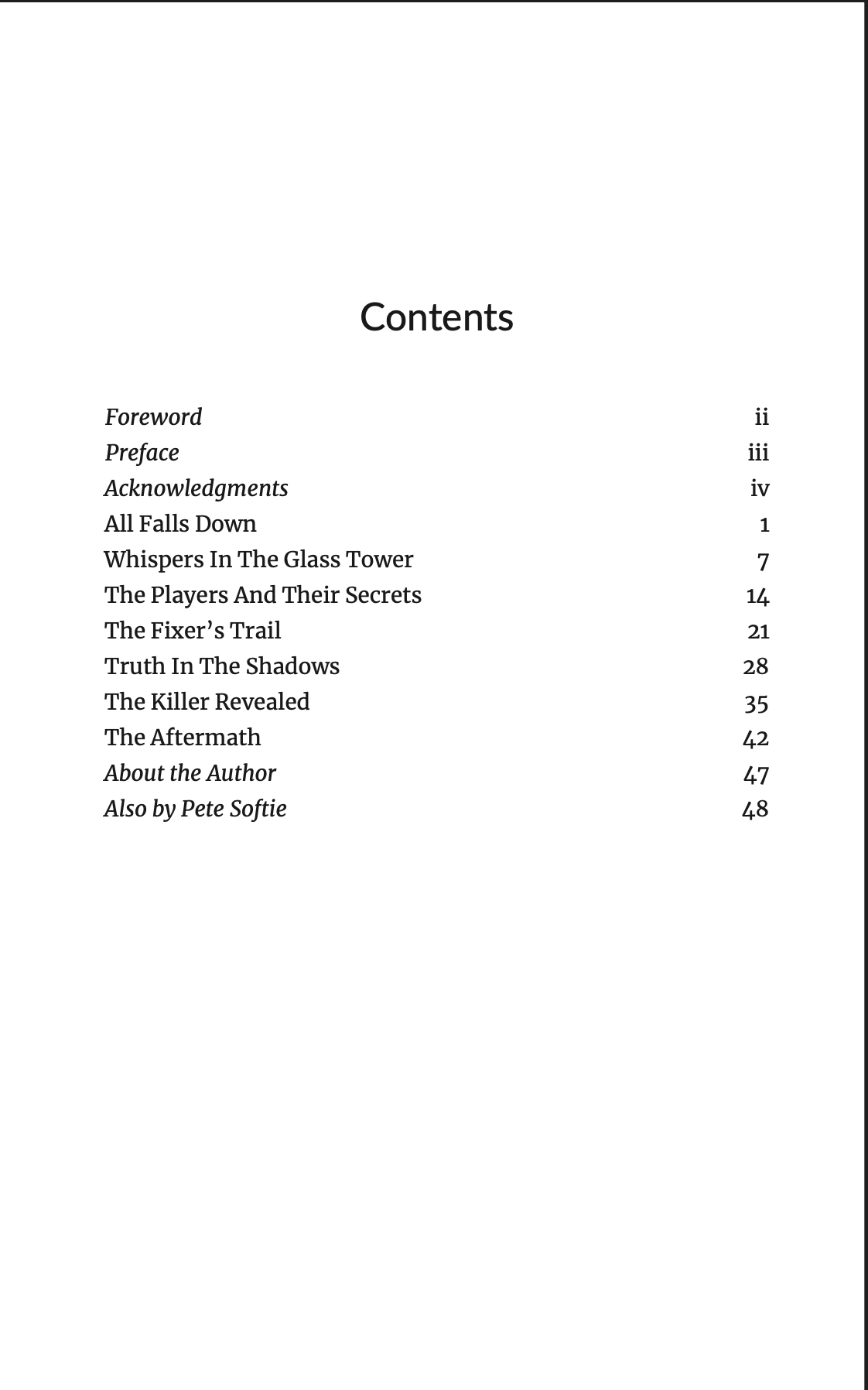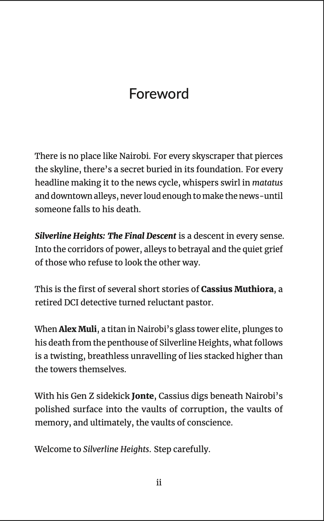 Fast-paced, razor-witted, and unflinchingly Kenyan, Silverline Heights: The Final Descent is the first in a gripping series of Cassius Muthiora short stories. For readers who love their mysteries gritty, their heroes complex, and their cities alive with danger.
