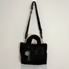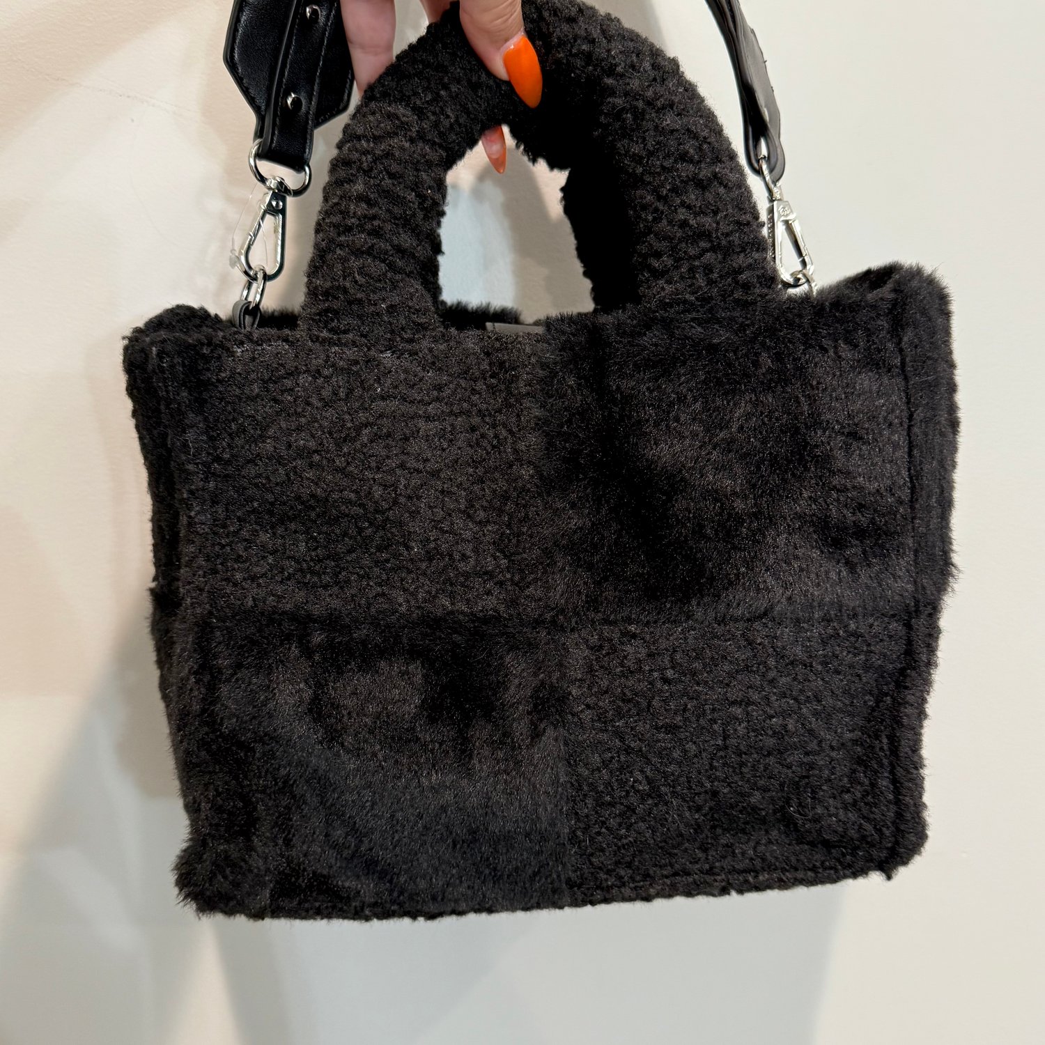 BCBG Maxazria black faux fur, black faux Sherpaand black faux leather patchwork top handle small tote bag that can be worn as a shoulder bag or crossbody with the adjustable strap that’s also removable. It has silver tone hardware with the branding embossed on the strap clips. There’s a flap magnet snap closure to one compartment which has the branding and zippered pocket along one wall and slips along the other wall.