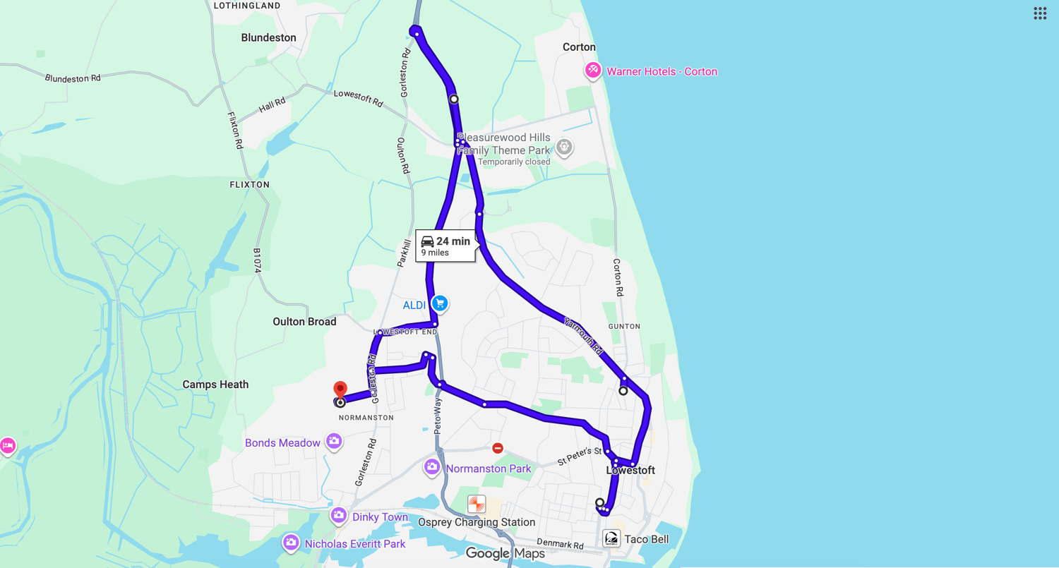Practise real driving test routes in Lowestoft(Mobbs Way) before your exam – open directly in Google Maps