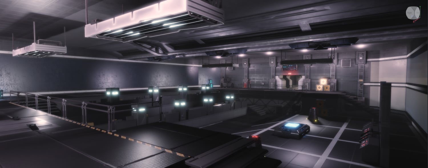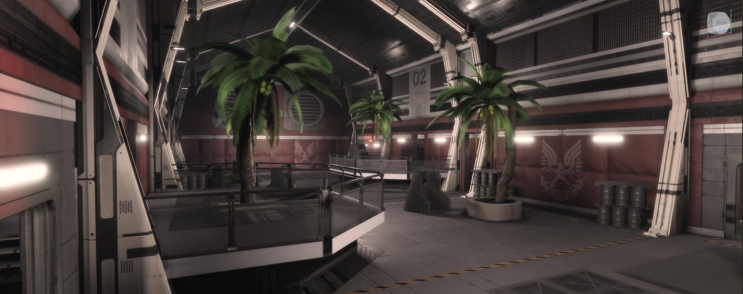 Lighting, scale, and structure design inspired by Halo’s visual style, creating a clean yet immersive military environment.
