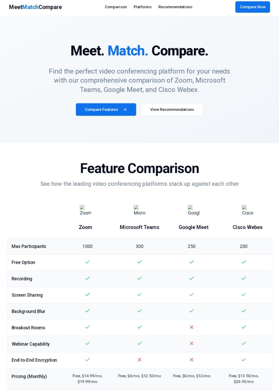 A clean, modern, and fully responsive HTML landing page template that compares four major online meeting platforms: Zoom, Microsoft Teams, Google Meet, and Cisco Webex — perfect for tech blogs, SaaS comparison sites, or digital tool directories.