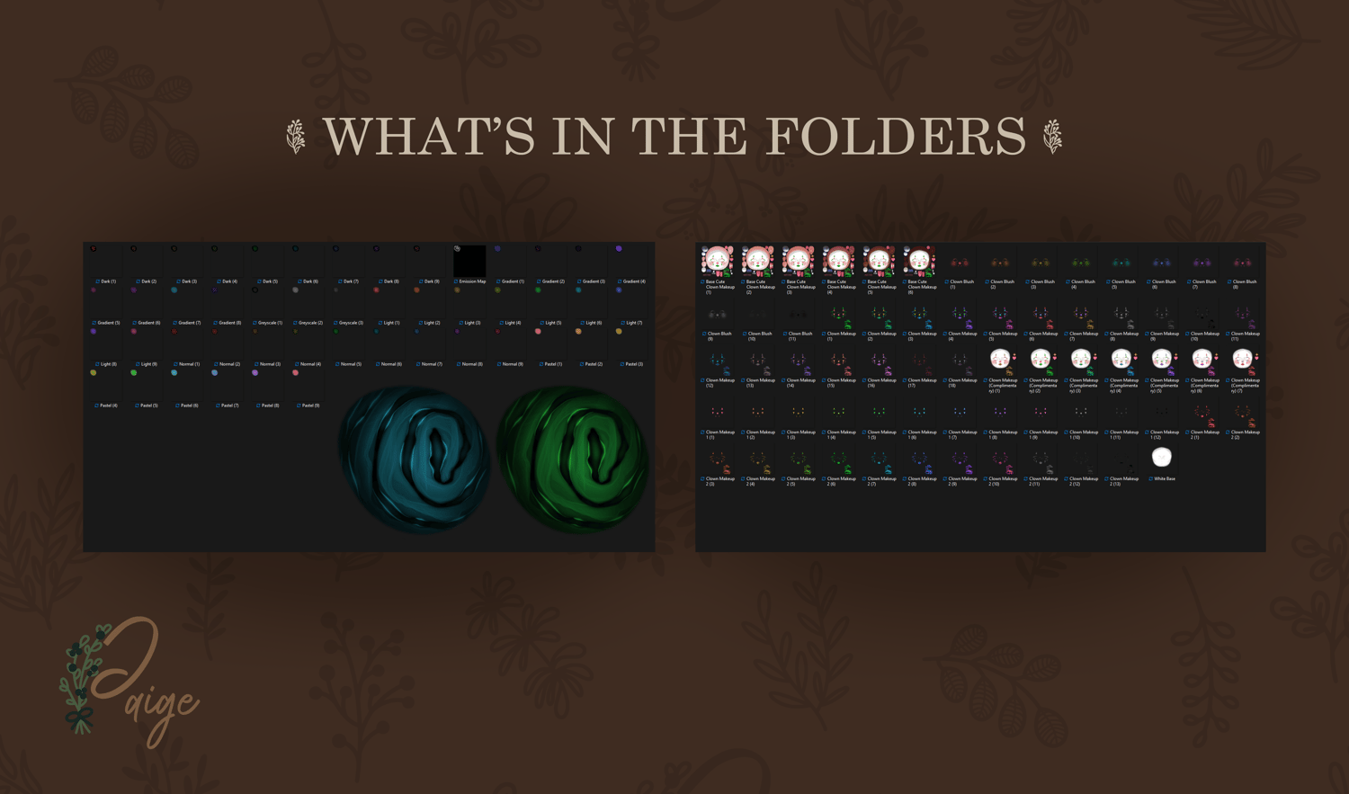 - 65+ clown face textures (makeup, overlays, transparents) in a wide variety of colors for endless mix-and-match