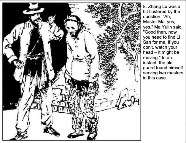8. Zhang Lu was a bit flustered by the question: "Ah, Master Ma, yes, yes." Ma Yulin said, "Good then, now you need to find Li San for me. If you don't, watch your head – it might be moving." In an instant, the old guard found himself serving two masters in this case.