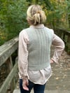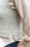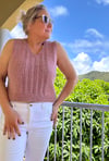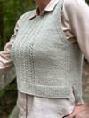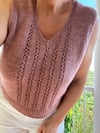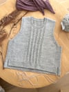RIPTIDE SLIPOVER is a cropped slipover with a cute, simple, lace textured central panel in the front and back. The armhole edges run seamlessly into the side broken rib panels to the front split hem.