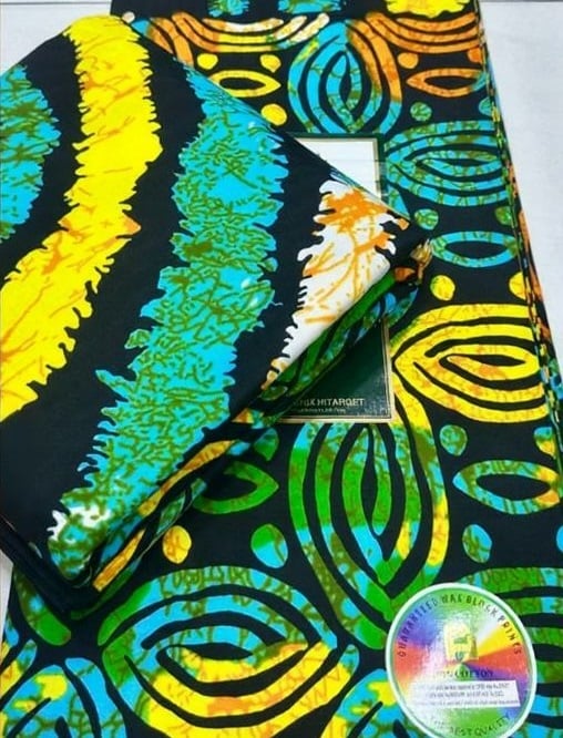 Step into elegance with this Premium Midnight Wave Hitarget Wax Print, designed in a captivating blend of black, yellow, teal, blue, and green. The bold wave-like stripes flow seamlessly into intricate circular motifs, creating a dynamic balance of movement and tradition.
