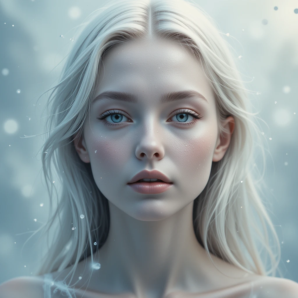 Pearl Gaze is a luminous, high-resolution digital artwork created by Æther天神. This portrait captures a fair-skinned woman with platinum-blonde hair, icy blue eyes, and an ethereal softness. Her expression is distant, poetic, and calm—as if suspended in a dream. Set against a pearl-grey misty background, the portrait reflects elegance and mystic clarity.