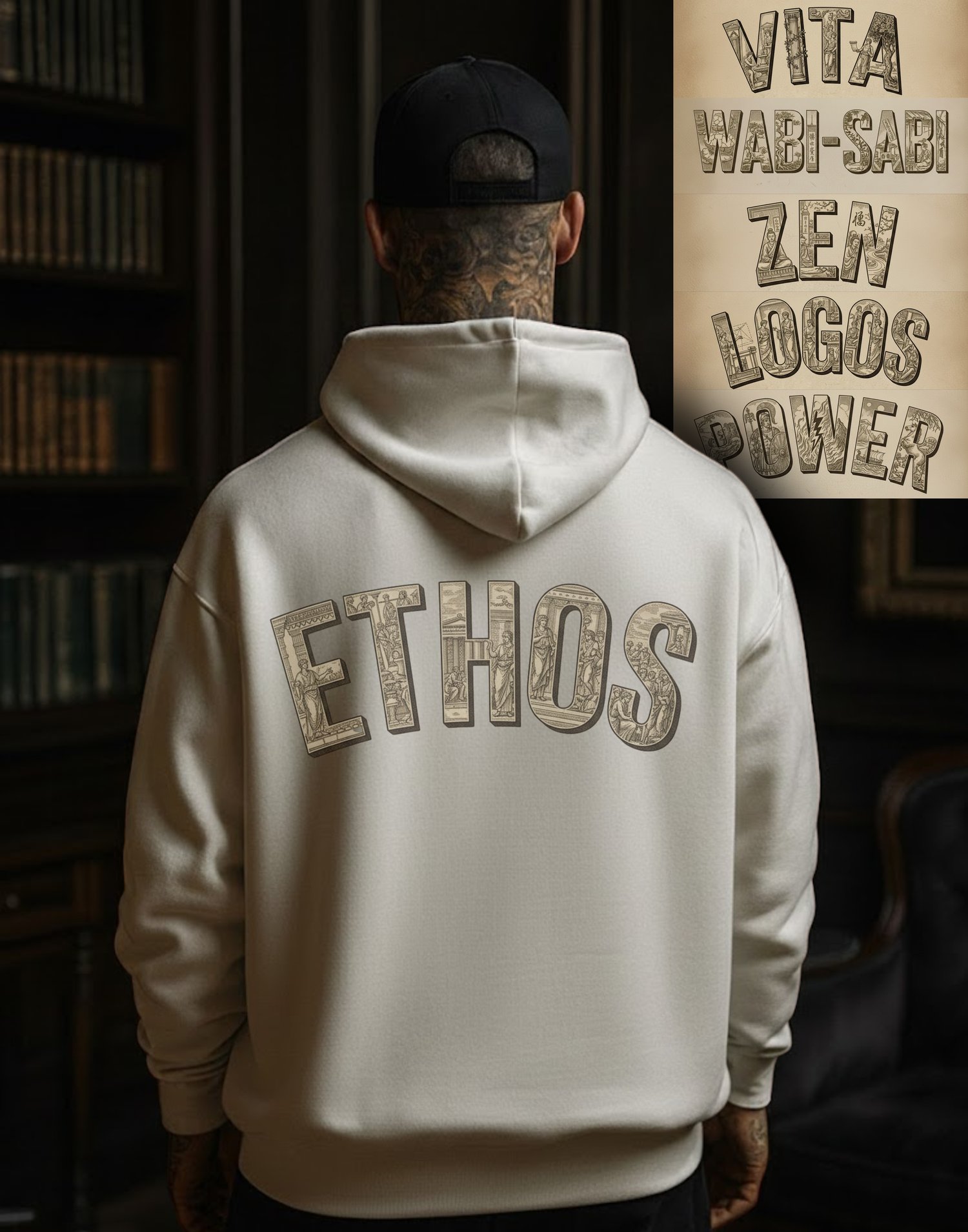 The graphics reference traditional print aesthetics and philosophical symbolism, reinterpreted for modern streetwear and visual branding.