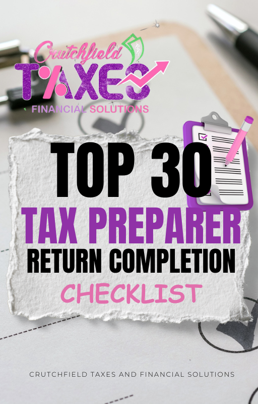 A detailed checklist covering 30 essential steps to review and complete tax returns accurately. Perfect for tax preparers who want to stay organized, compliant, and error-free.