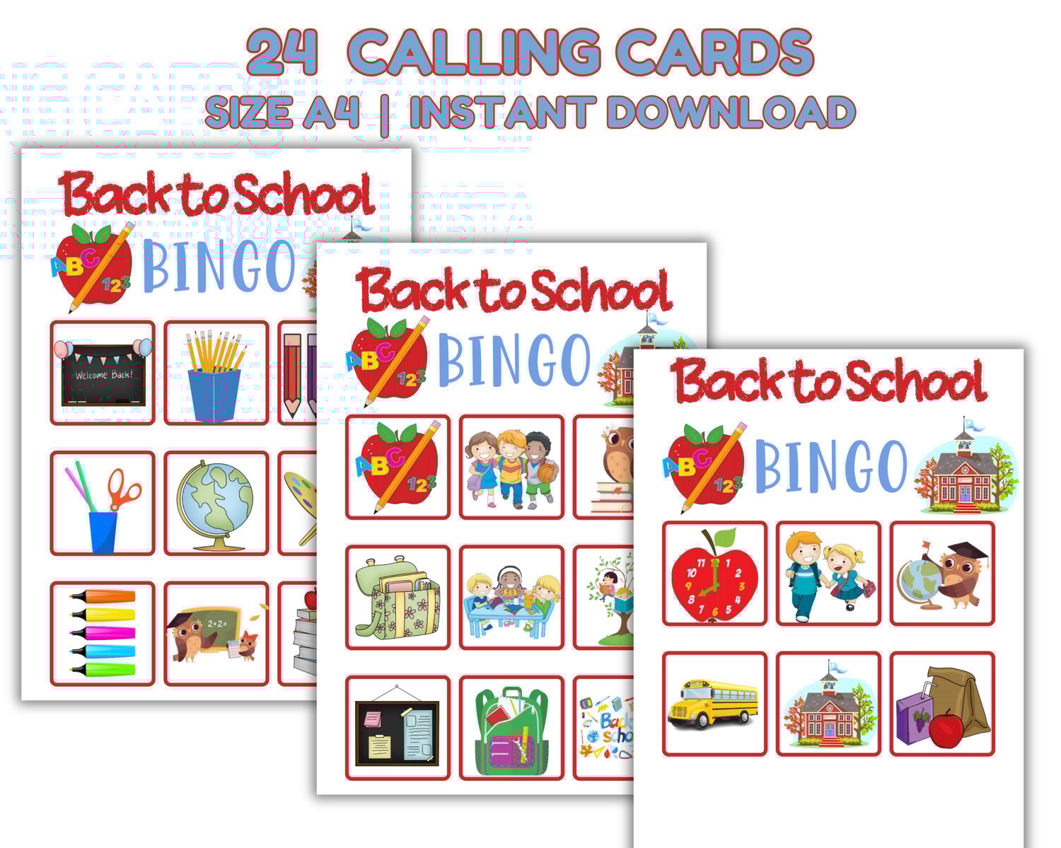 ➤ You will receive (30) printable Back to Scchool Bingo Cards, (3) pages of Back to School Calling Cards and, (3) pages of Back to School token sheets. Simply print and have fun!