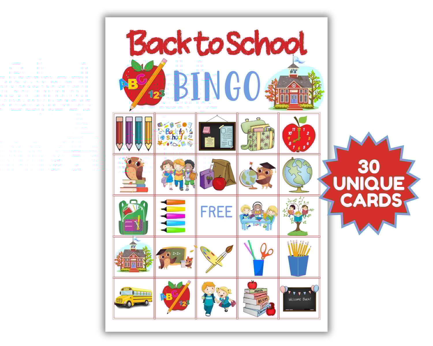 This Fun Back to School Bingo Game Set in vibrant colors is the ideal classroom, first day of school or anytime classroom activity. The printable game features 5x5 grid cards of fun school related graphics. 24 calling cards and 3 different sets of back to school markers/chips.