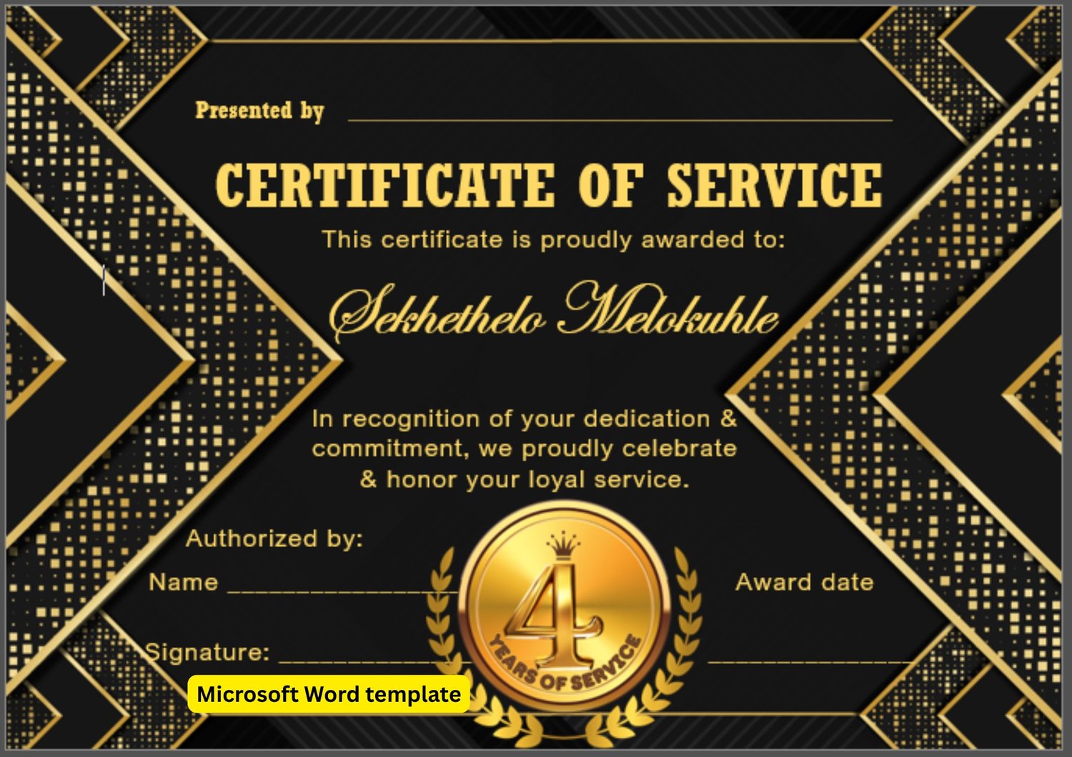 Mark a significant milestone in your employees' journey with our exclusive "04 Years of Service" digital certificate template for MS Word.