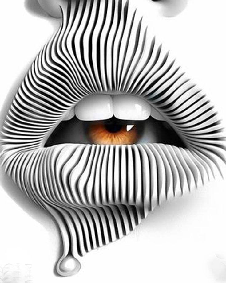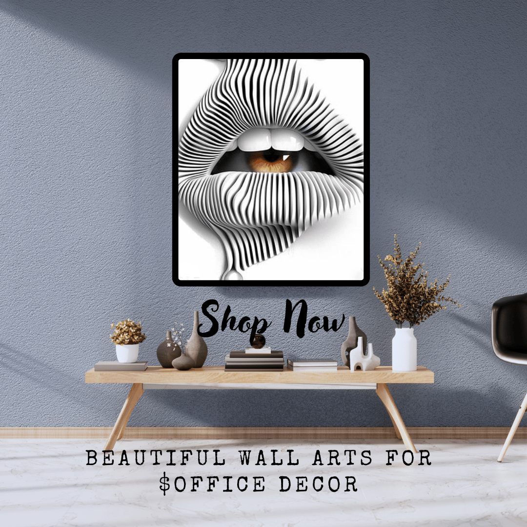 Elevate your space with this captivating piece of abstract art that seamlessly blends surrealism and modern design. Featuring bold, flowing black and white lines that form lips, revealing an intense, golden-hued eye at the center—this artwork is a powerful symbol of perception and expression.