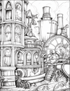 Cityscapes and Villages: Journey through steampunk cityscapes with soaring skyscrapers and bustling streets, or wander into charming villages adorned with eccentric steam-powered devices. The illustrations offer a diverse range of settings, allowing for a rich and immersive coloring experience.