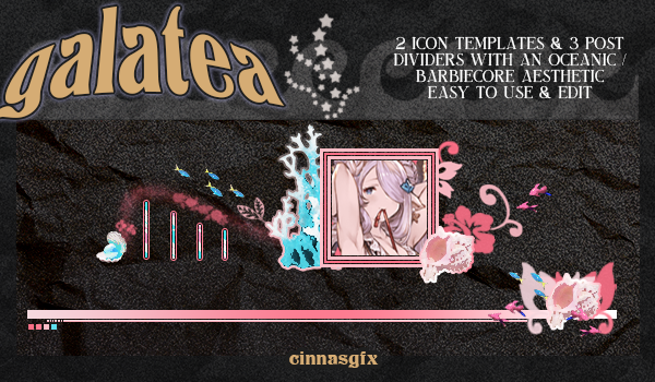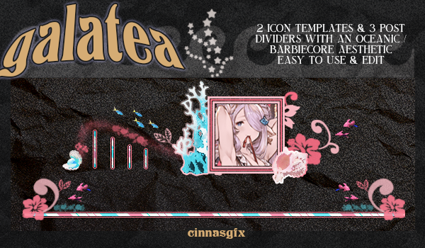 Two summer icon templates & 3 post dividers with an oceanic and barbiecore aesthetic. There are a few blockquotes on both templates while being wide enough to cover the post width. The images used in the preview are not included with the psd file. Easy to edit if you're familiar with the following: smart objects, layer styles and layer masks.