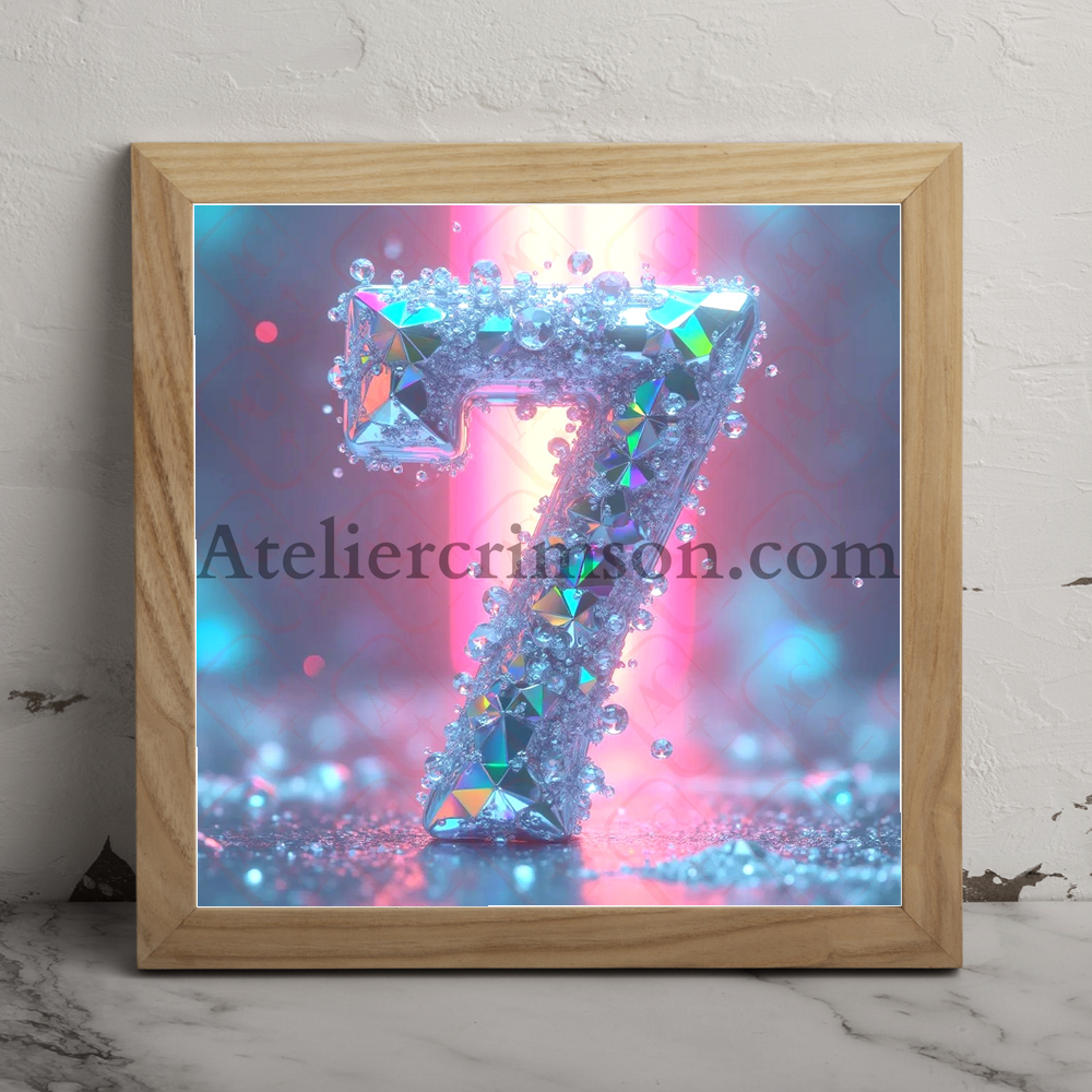 Number 7 crystalline Retro Futuristic C A unique creation blending retro-futuristic aesthetics and geometric elegance. Each character is sculpted from iridescent crystals in vibrant, nostalgic hues, set in delicate silver filigree. Against a gradient background transitioning from deep purple to teal blue, this digital artwork captures the essence of 80s-inspired digital art with a touch of crystalline luxury. Perfect for typography enthusiasts, digital art lovers, and those who appreciate retro-futuristic aesthetics.