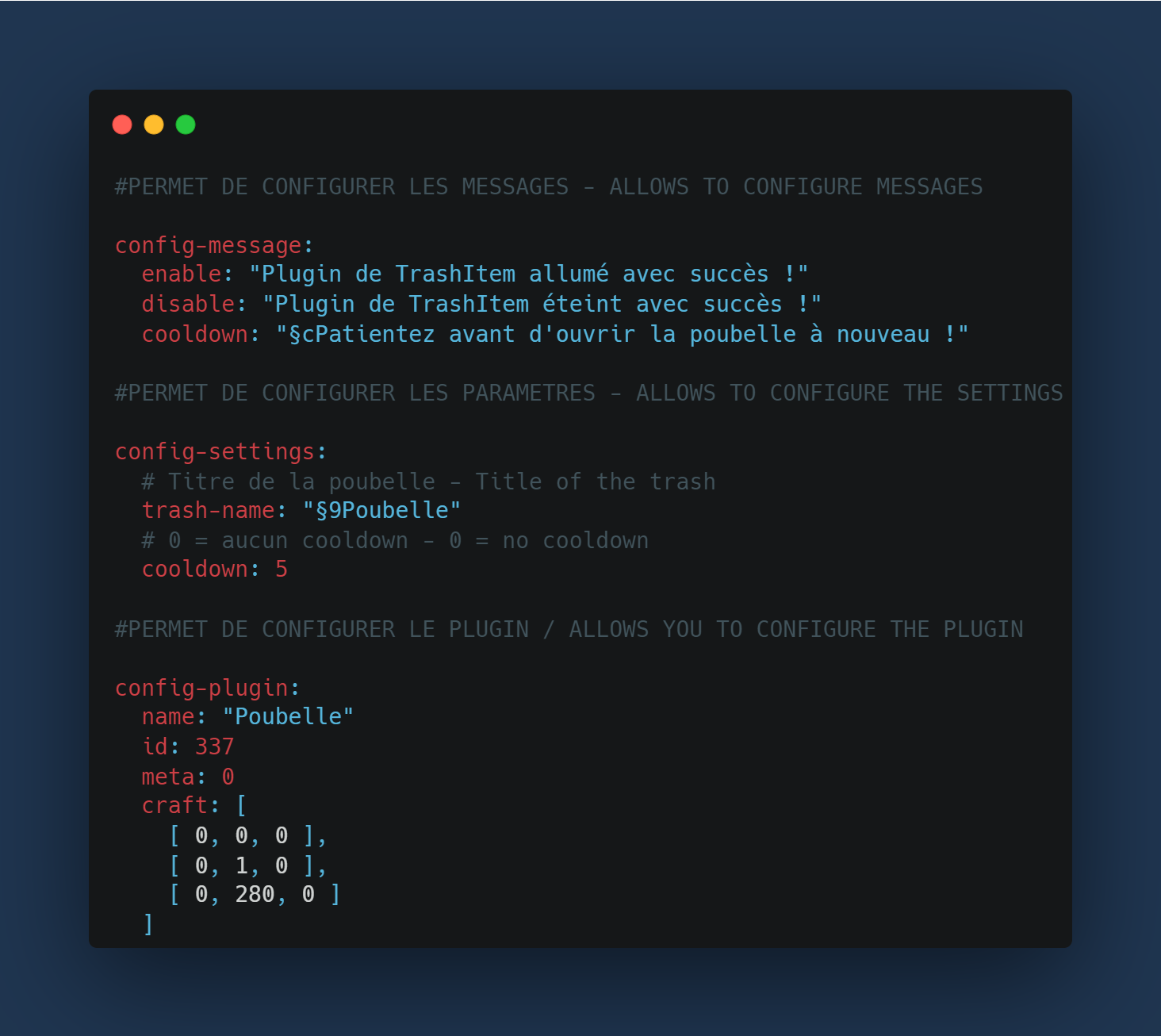Un plugin de TrashItem, c'est un item qui permet de vous ouvrir une poubelle sous forme d'inventaire, vous pourrez jeter et trier tout votre inventaire dans cette poubelle, elle se vide à chaque fermeture de celle-ci.