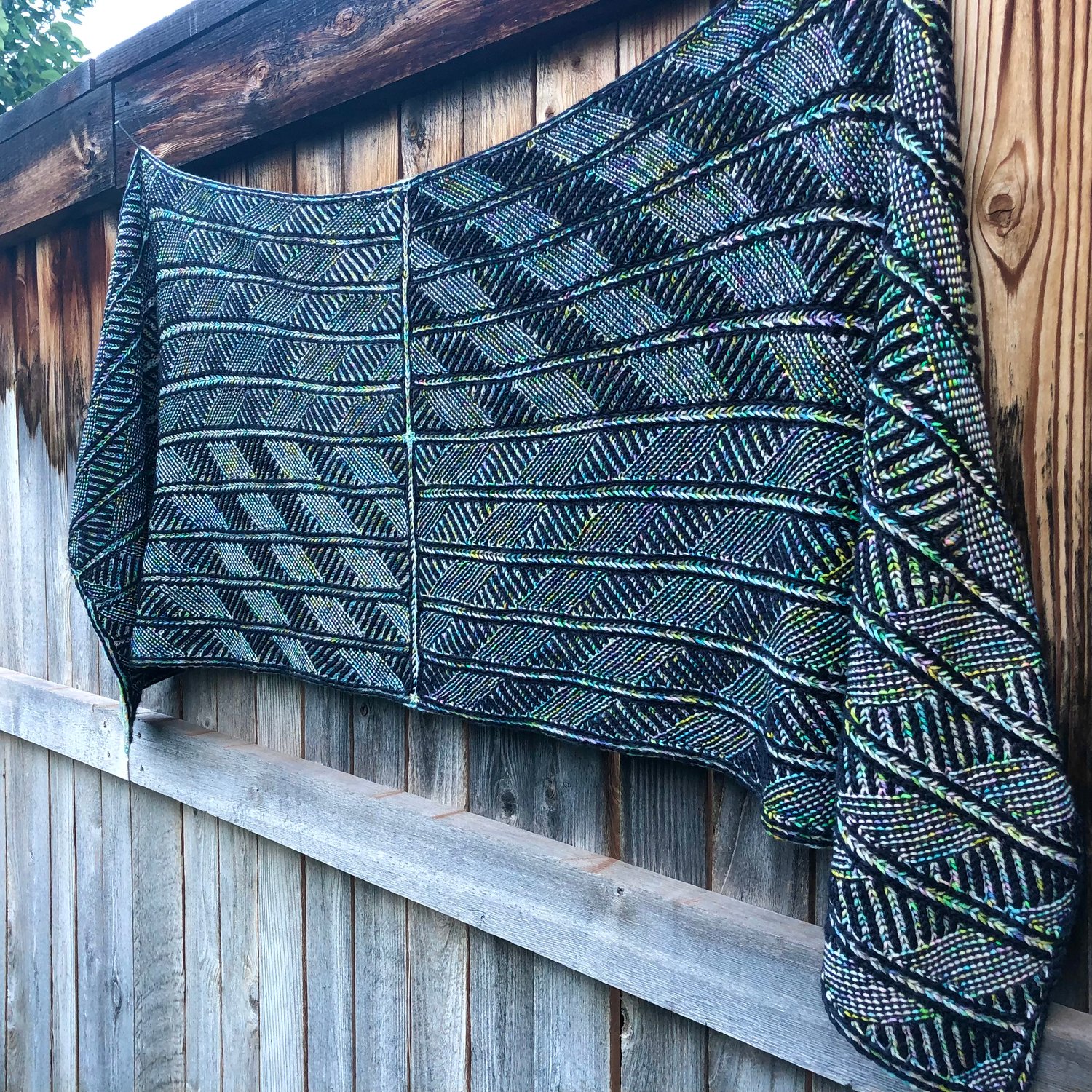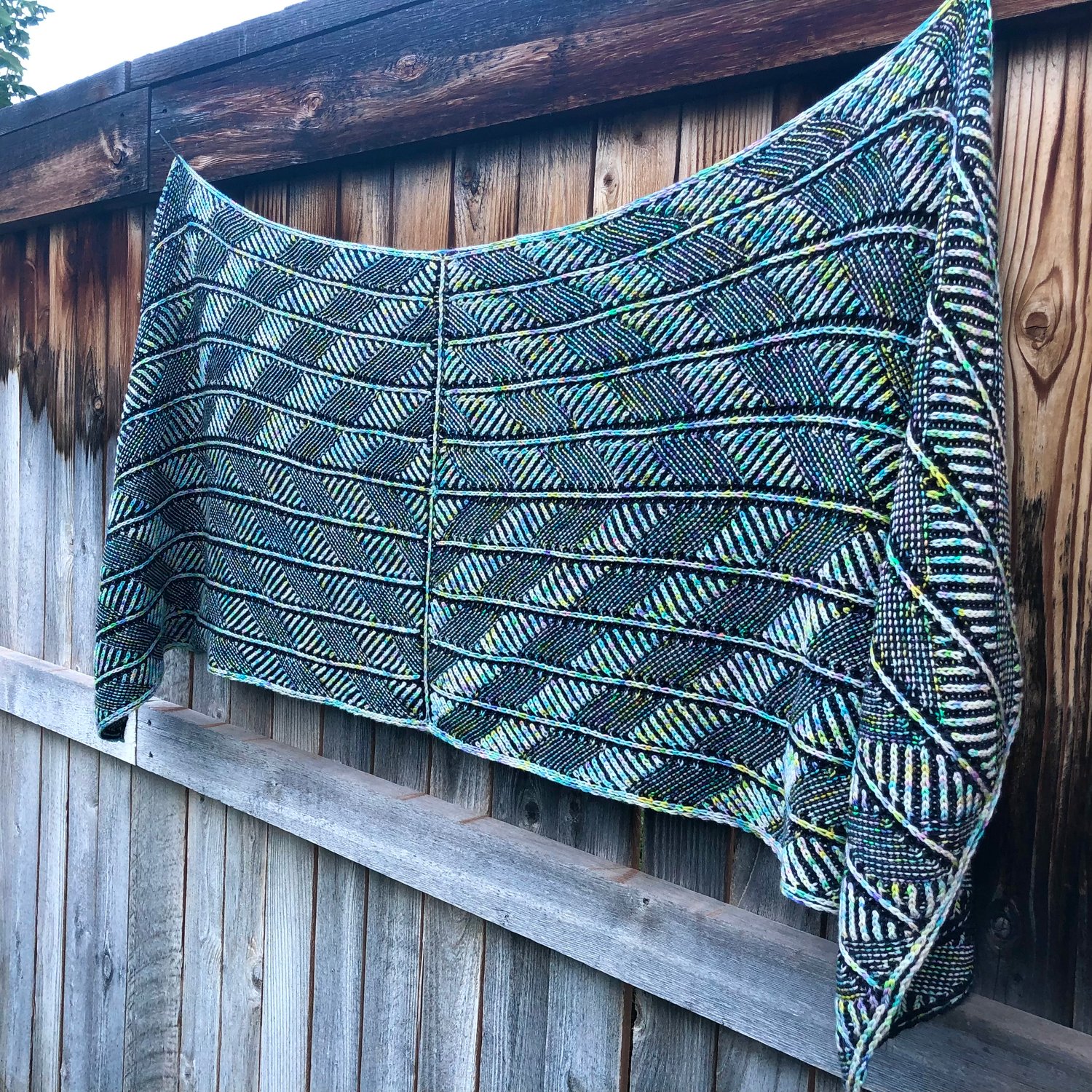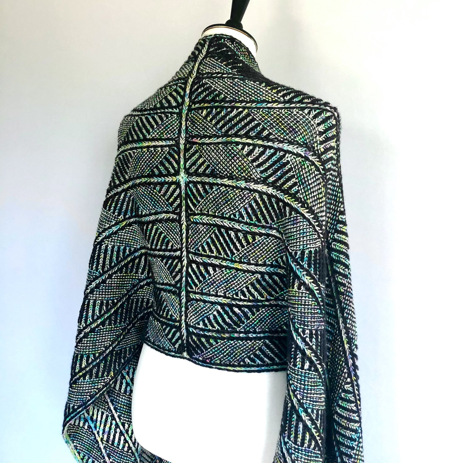 The Saturn Rain Wrap is a gorgeous seamless rectangular wrap that is completely reversible. Alternating rows of two-color brioche and two-color garter stitch form the pattern of concentric diamonds. Lines worked parallel to the edges of the wrap add interest to the stitch pattern and give it an architectural flair. The wrap is worked first in the round, then divided and worked flat in parts.