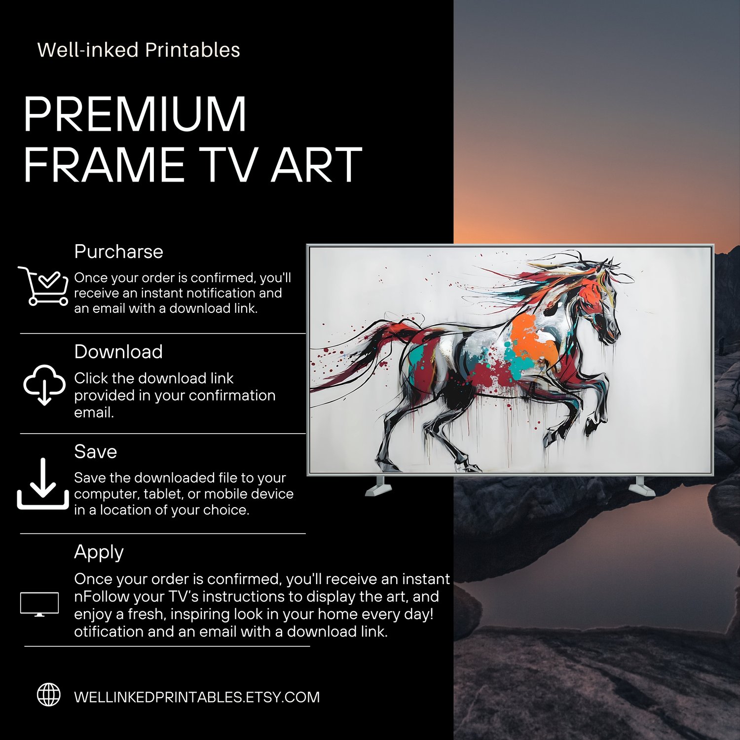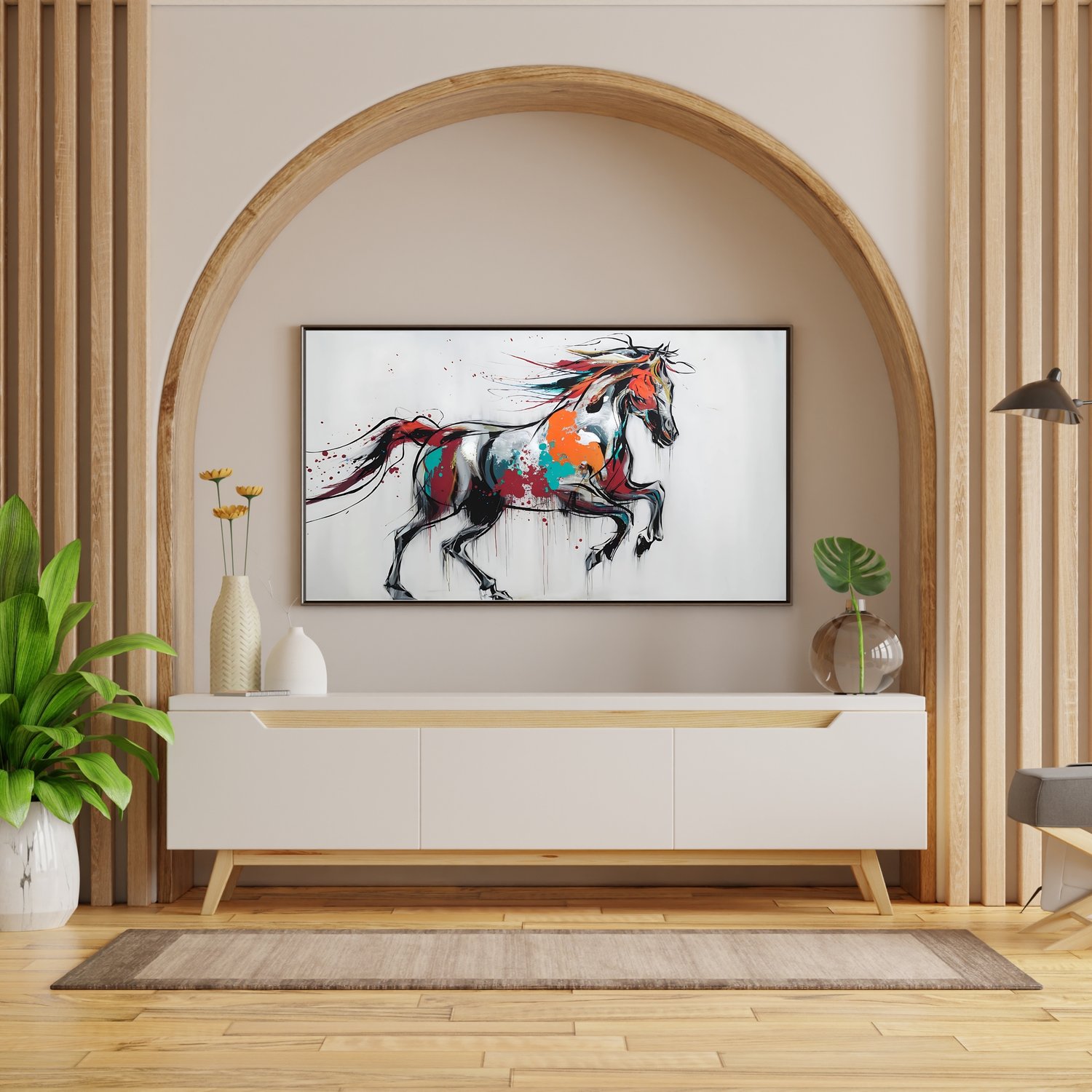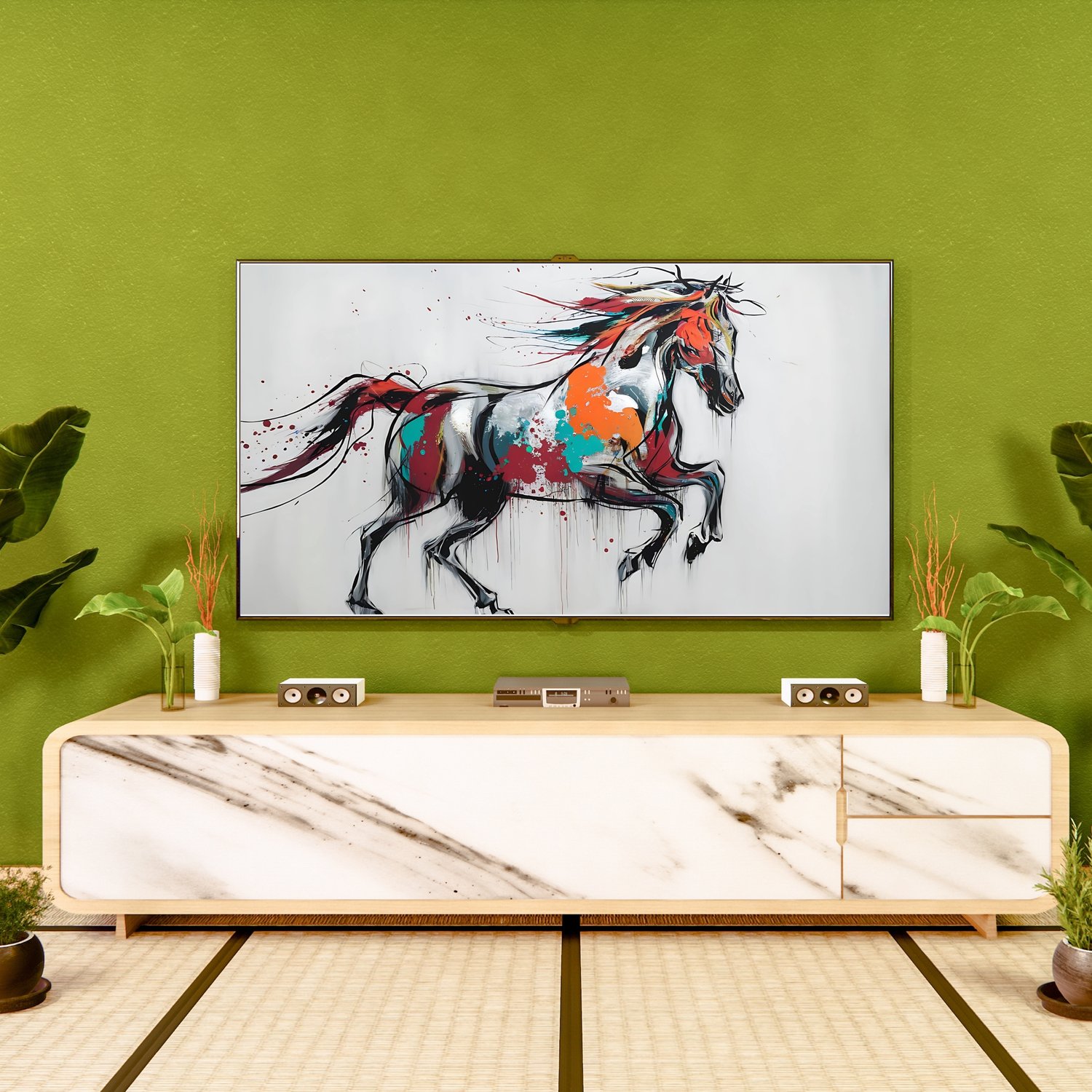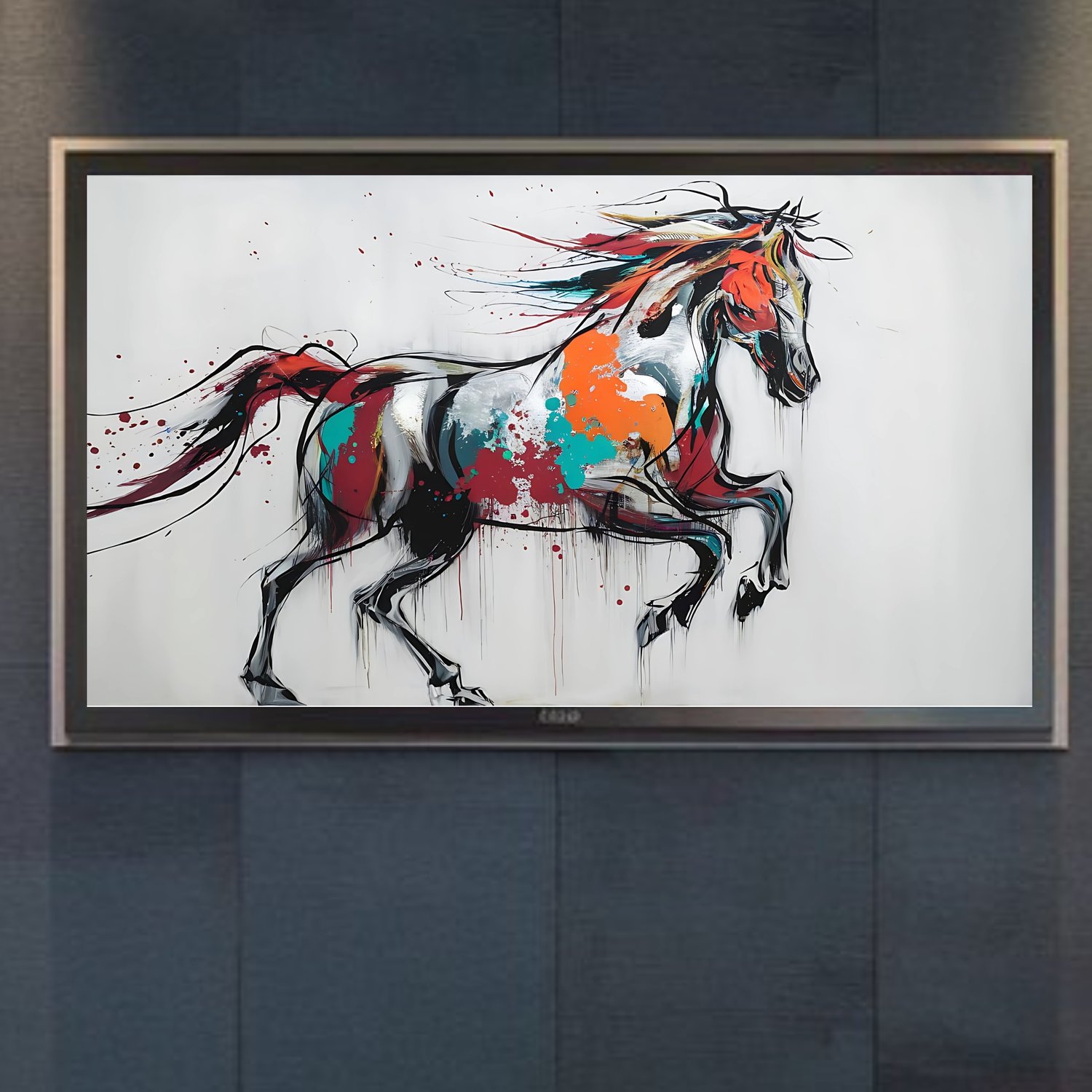 Transform your TV into a bold artistic statement with this **Abstract Horse Silhouette Art**. Featuring a powerful horse rendered in fluid black brushstrokes and exploding with fiery reds, radiant oranges, electrifying teal, and shimmering silver, this piece captures the raw spirit of motion and emotion. **Created using AI-enhanced design tools**, this digital artwork blends human creativity with cutting-edge technology for a truly unique masterpiece. Perfect for Frame TVs, tablets, or digital displays, it’s a fusion of abstract expressionism and modern elegance that demands attention.