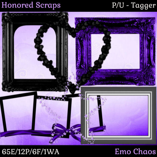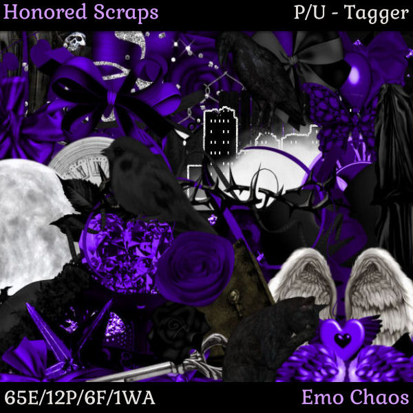 Emo Chaos is a tagger kit that consists of 65 elements, 12 papers, 6 frames and 1 word art.