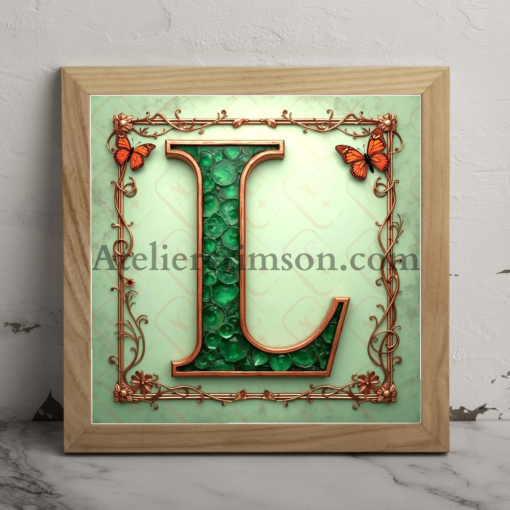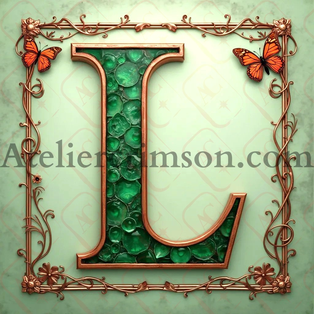 The letter L emerald and copper Art Nouveau Intricate design with floral patterns, butterflies, and vines. Elegant sage green background. Perfect for vintage lovers and typography enthusiasts.