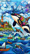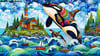 Beautiful big killer whale & baby with spirograph patterns & spirograph waves. There are ships, a lighthouse & some cliff sea houses.