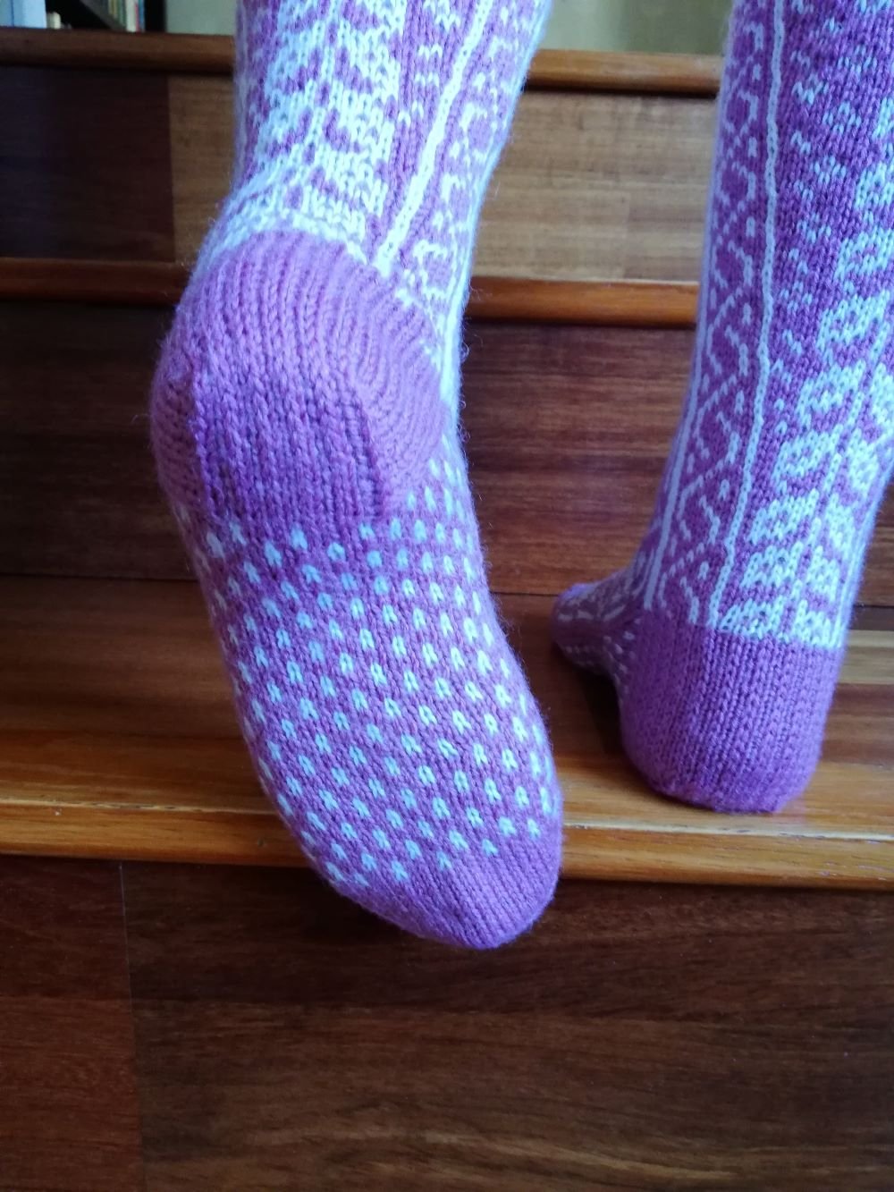Mallisukat on neulottu pyöröpuikoilla, mutta ohjeen alussa kerron kuinka jaat silmukat sukkapuikoille.