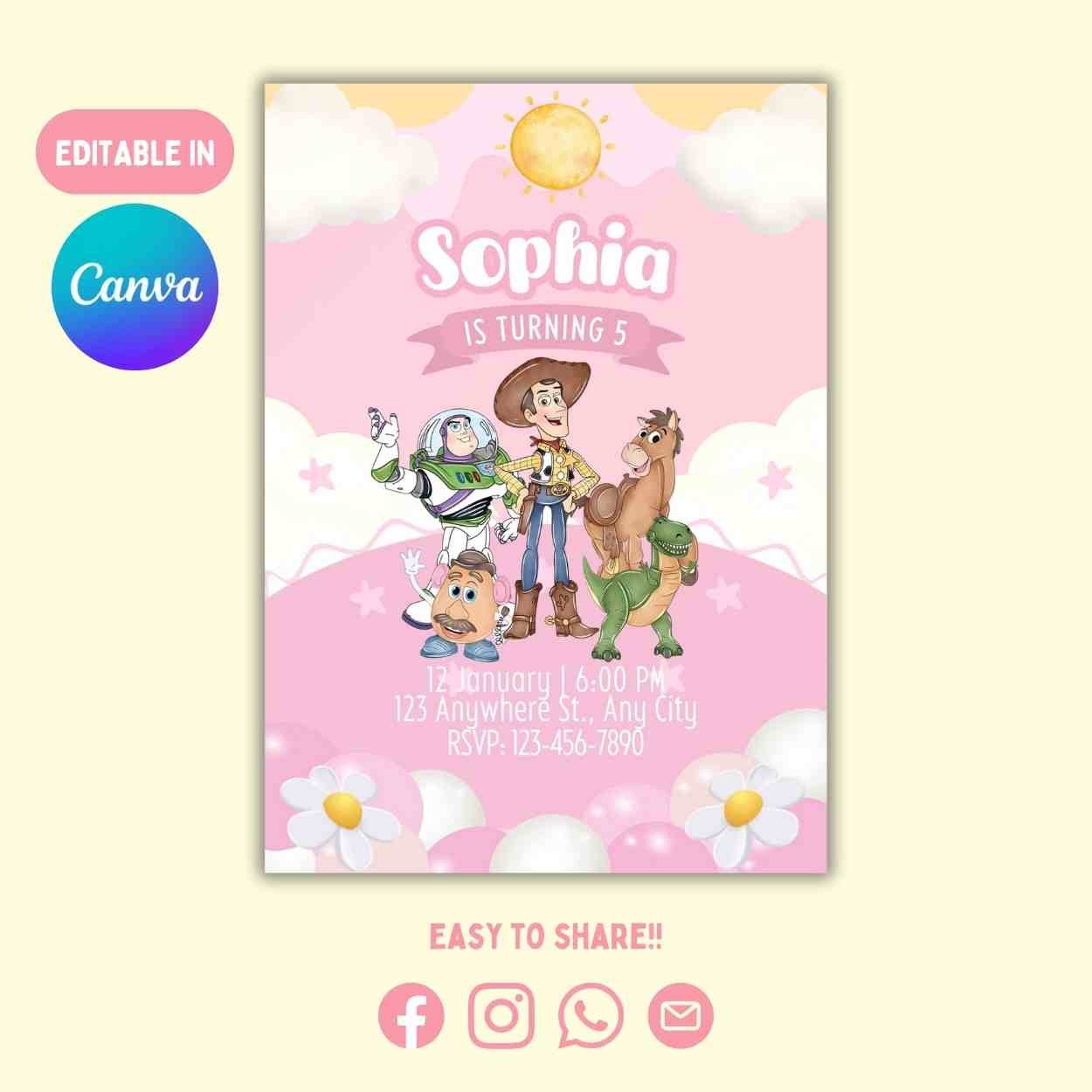 Invitación de Cumpleaños Editable Toy Story Rosa (Canva)