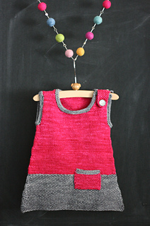 Requires any DK weight yarn from 215-375 yards total. One skein each of two colors of the yarns recommended above will make a dress in all sizes.