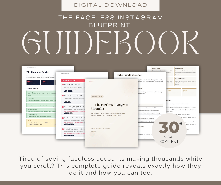 Plus: Common mistakes that kill faceless accounts, essential tools list, engagement tactics, and trust-building strategies that convert followers to buyers.