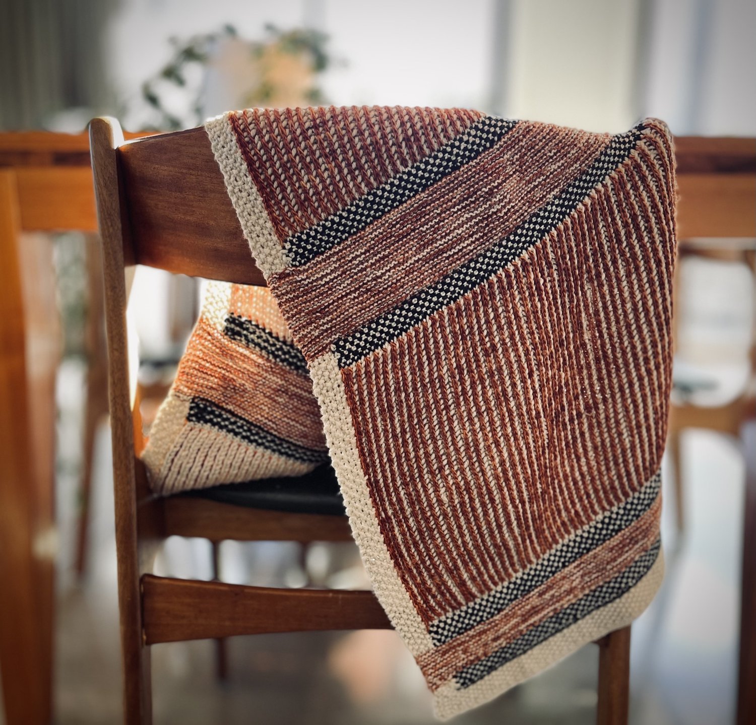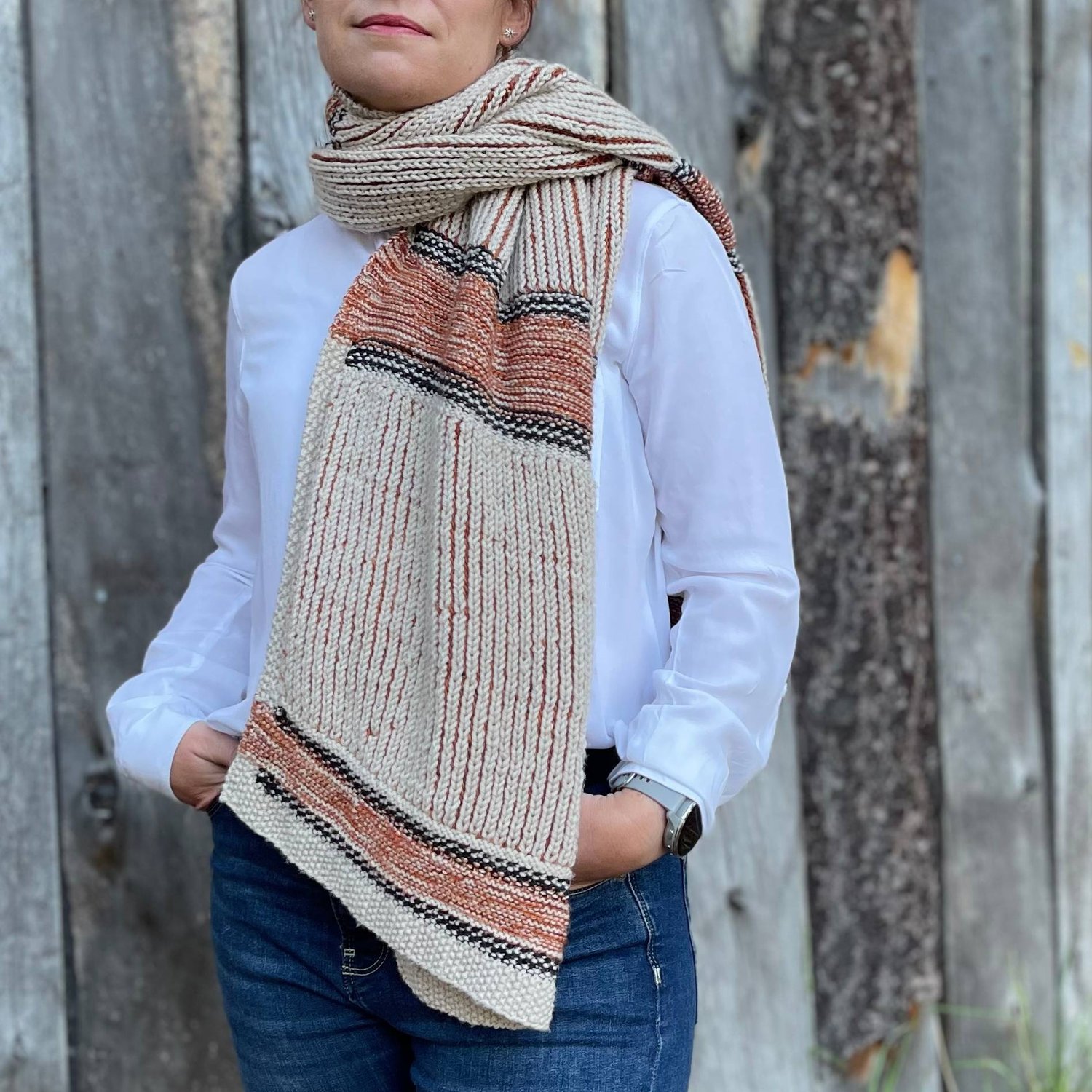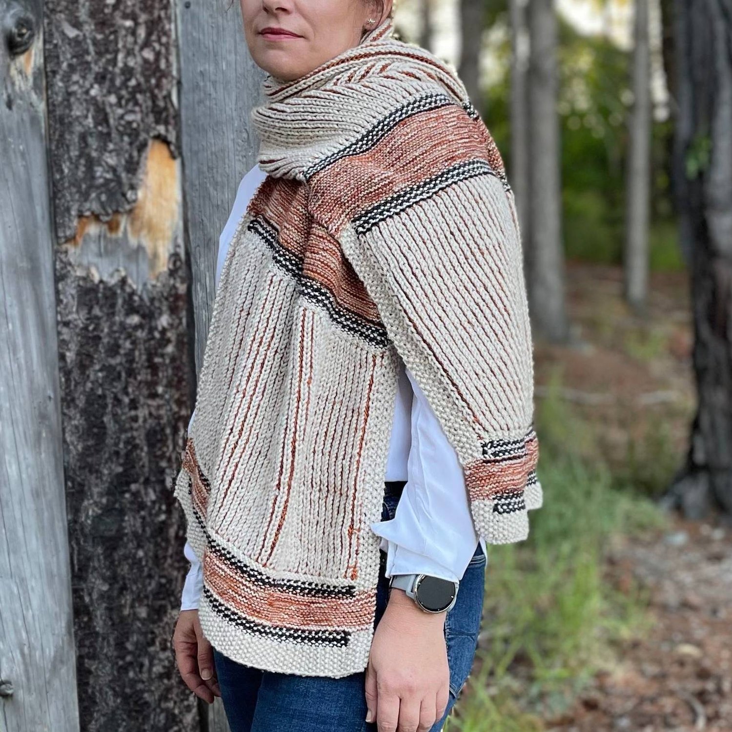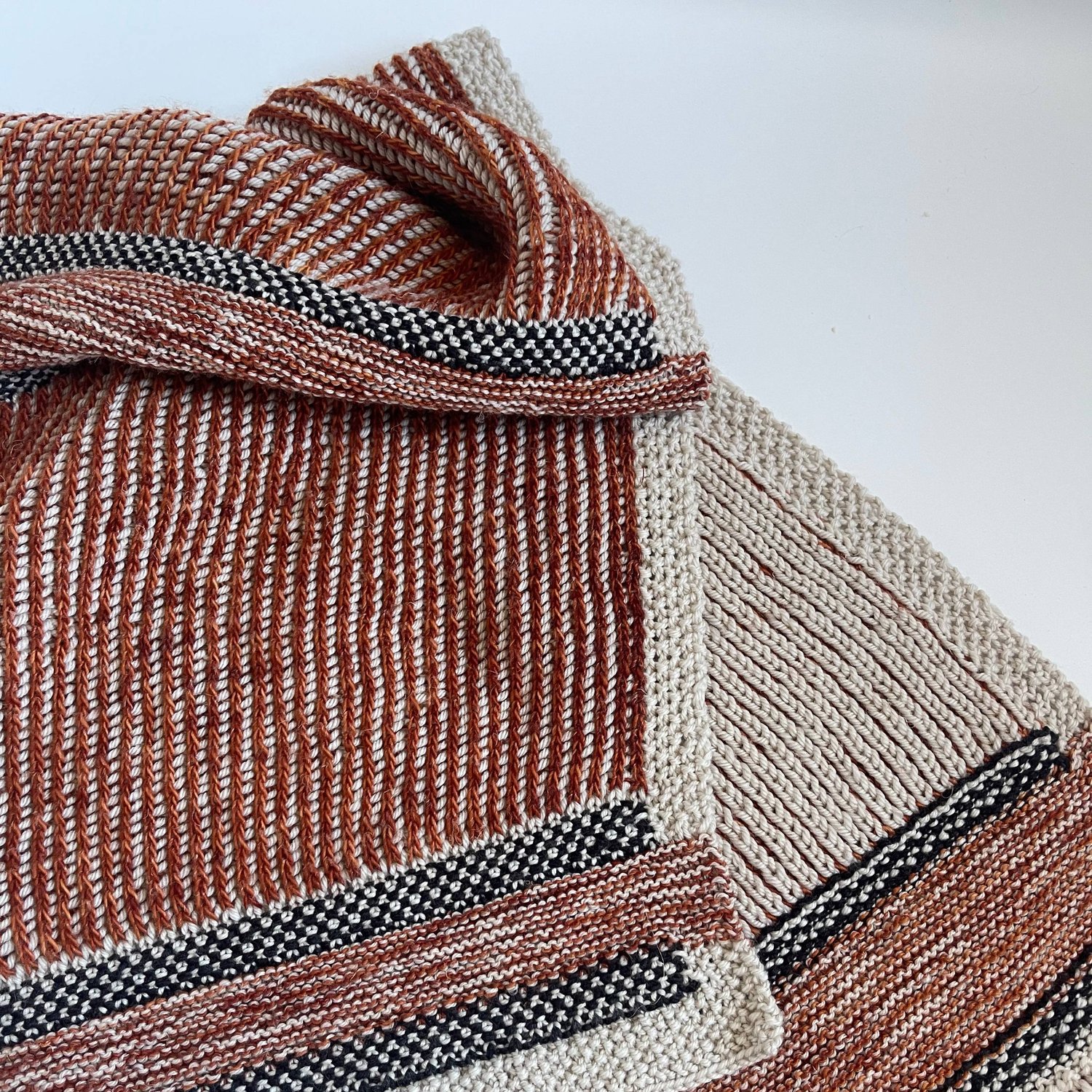 Our objective for the The Bay Panel Shawl was to create a versatile and distinctive wardrobe piece. It incorporates alternating panels of linen stitch, brioche stitch, and garter stitch, framed by a moss stitch border.
