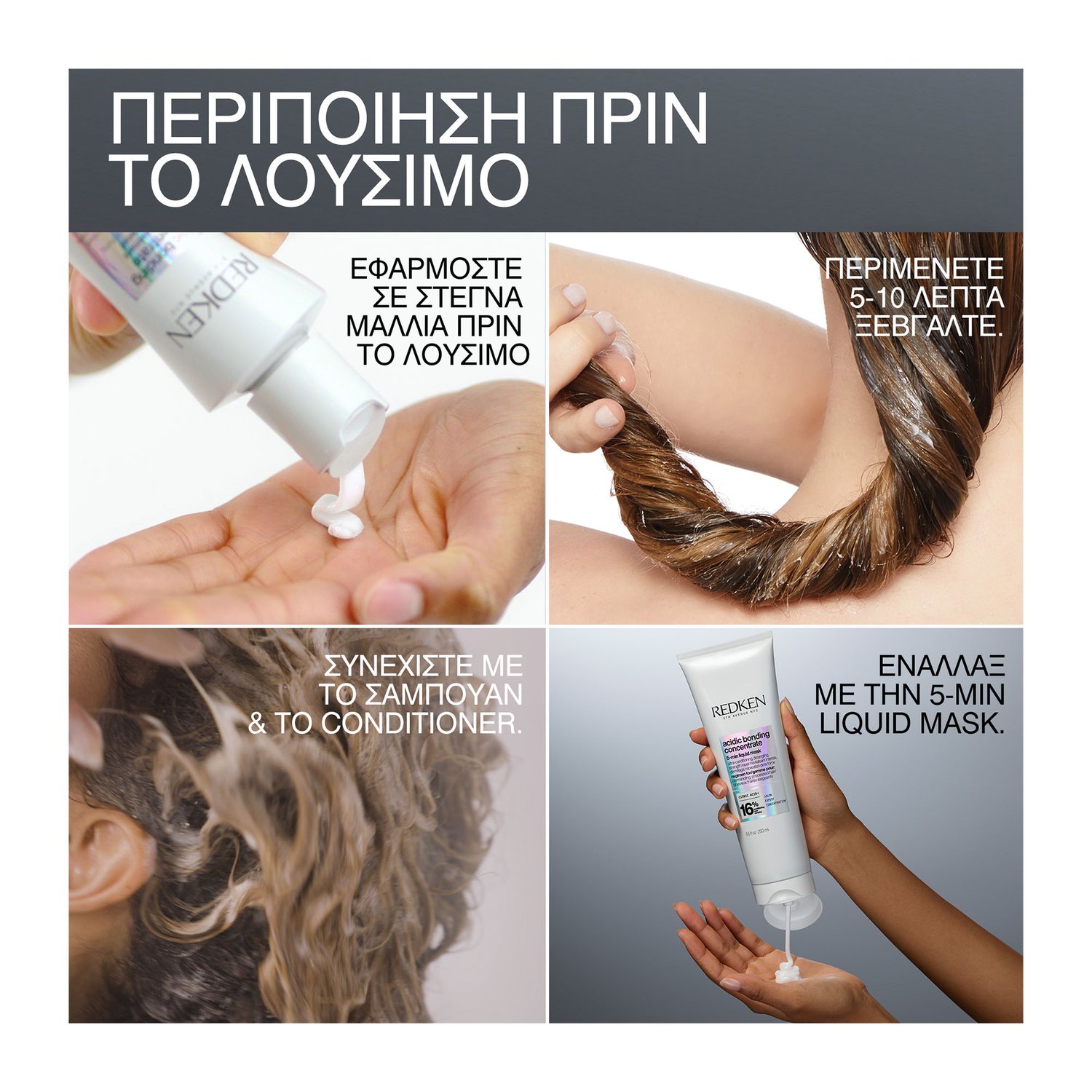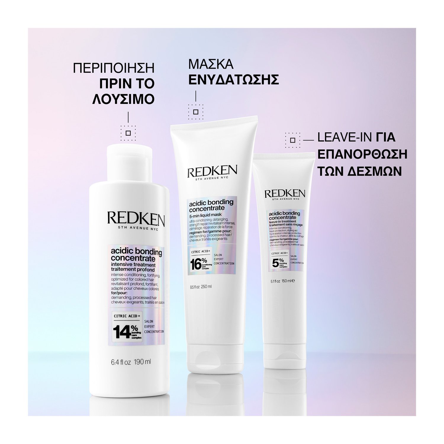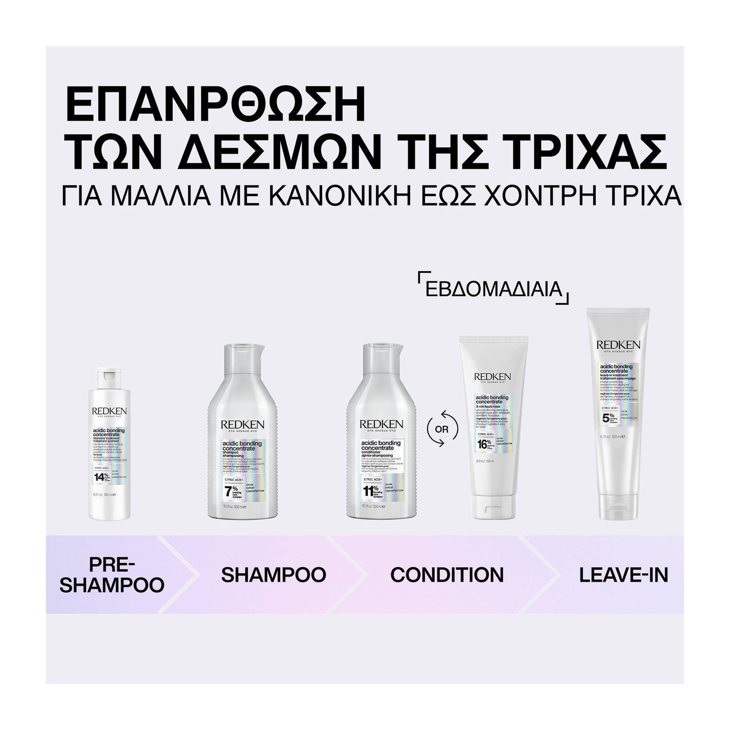 Το Acidic Bonding Concentrate Intensive Treatment μεταμορφώνει και επανορθώνει τα μαλλιά σε 1 απλό βήμα με άμεσα αποτελέσματα.* Επανορθώνει και προστατεύει την τρίχα από υπηρεσίες βαφής, θερμότητα και περιβαλλοντικούς παράγοντες. Με 14% Citric Acid + Bonding Care Complex είναι η πιο συμπυκνωμένη φόρμουλα της Redken μέχρι σήμερα για μαλλιά που είναι 2 φορές πιο δυνατά*, 14 φορές πιο λεία* και 90% περισσότερο ενυδατωμένα.Παράλληλα, ενδυναμώνει και προστατεύει την τρίχα από το σπάσιμο** και περιποιείται τα ταλαιπωρημένα μαλλιά από μέσα προς τα έξω **. *VS. ΣΑΜΠΟΥΑΝ ΧΩΡΙΣ ΜΑΛΑΚΤΙΚΗ δράση ** ΧΡΗΣΗ ACIDIC BONDING CONCENTRATE ΠΕΡΙΠΟΙΗΣΗ ΠΡΙΝ ΤΟ ΛΟΥΣΙΜΟ, ΣΑΜΠΟΥΑΝ ΚΑΙ CONDITIONER
