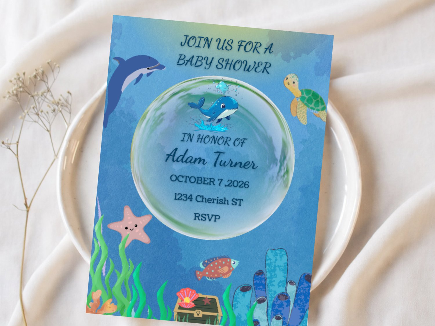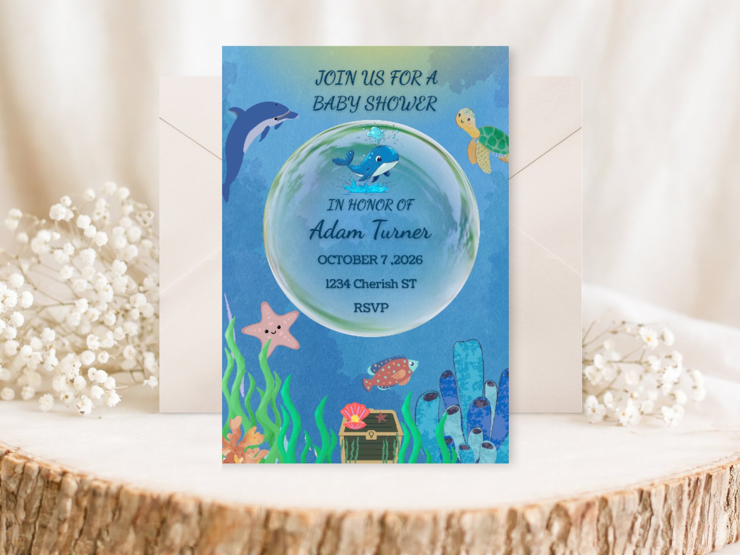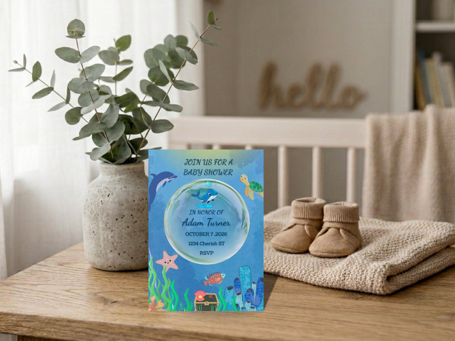 Welcome a little one with this adorable Under the Sea themed baby shower invitation! Designed with soft pastel sea creatures and a gentle ocean backdrop, this printable invite is perfect for celebrating a baby boy, girl, or gender-neutral shower.