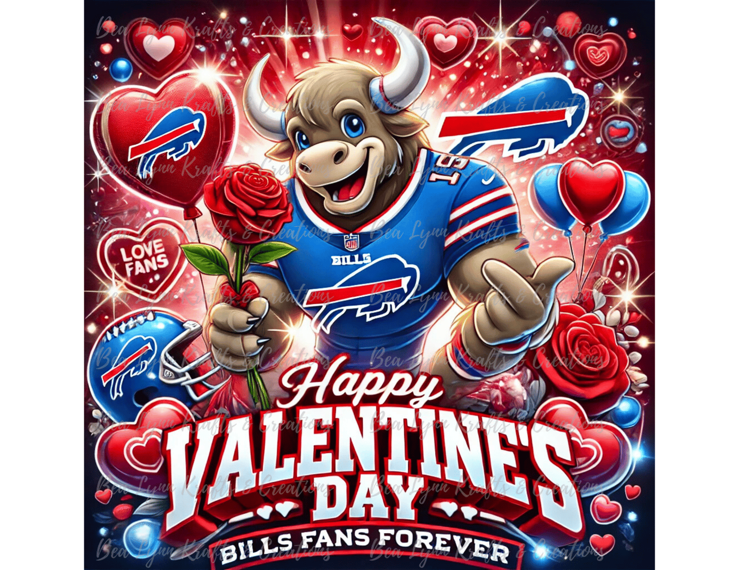 Celebrate love and team pride with this Buffalo Bills-themed Valentine's Day transparent PNG! This festive design features the Bills mascot in a cheerful Valentine’s Day scene, surrounded by heart-shaped balloons, roses, and glowing red, pink, and white accents. The iconic Buffalo Bills logo is beautifully displayed in the background with glowing effects, paired with the text “Happy Valentine’s Day” and “Bills Fans Forever” in bold, modern lettering. Perfect for creating one-of-a-kind Valentine’s Day projects that show your Bills pride!