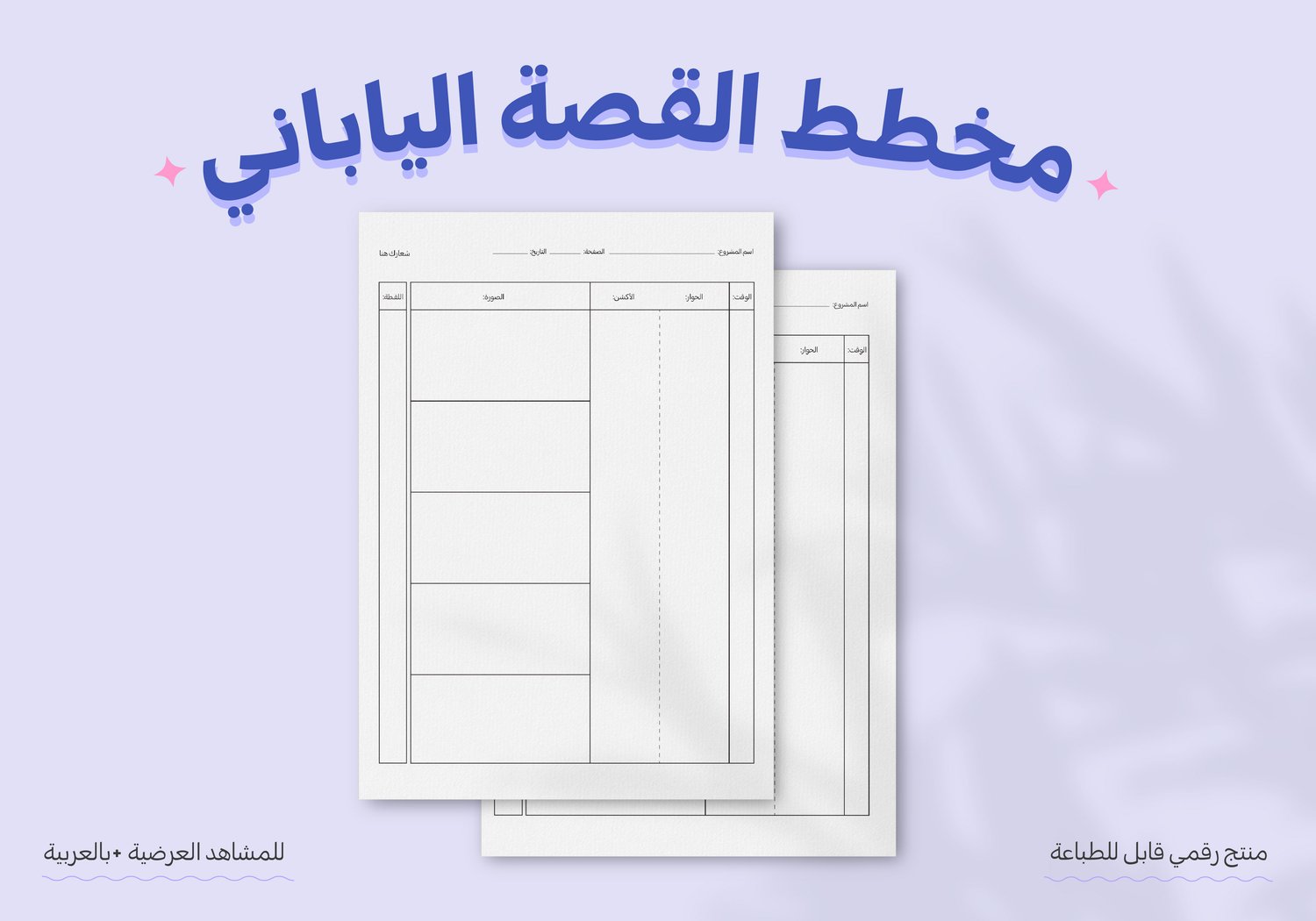 This Arabic template helps you organize your project scenes easily, such as landscape-size videos. You can add your logo at the top left of the page. The template is a printable digital product.