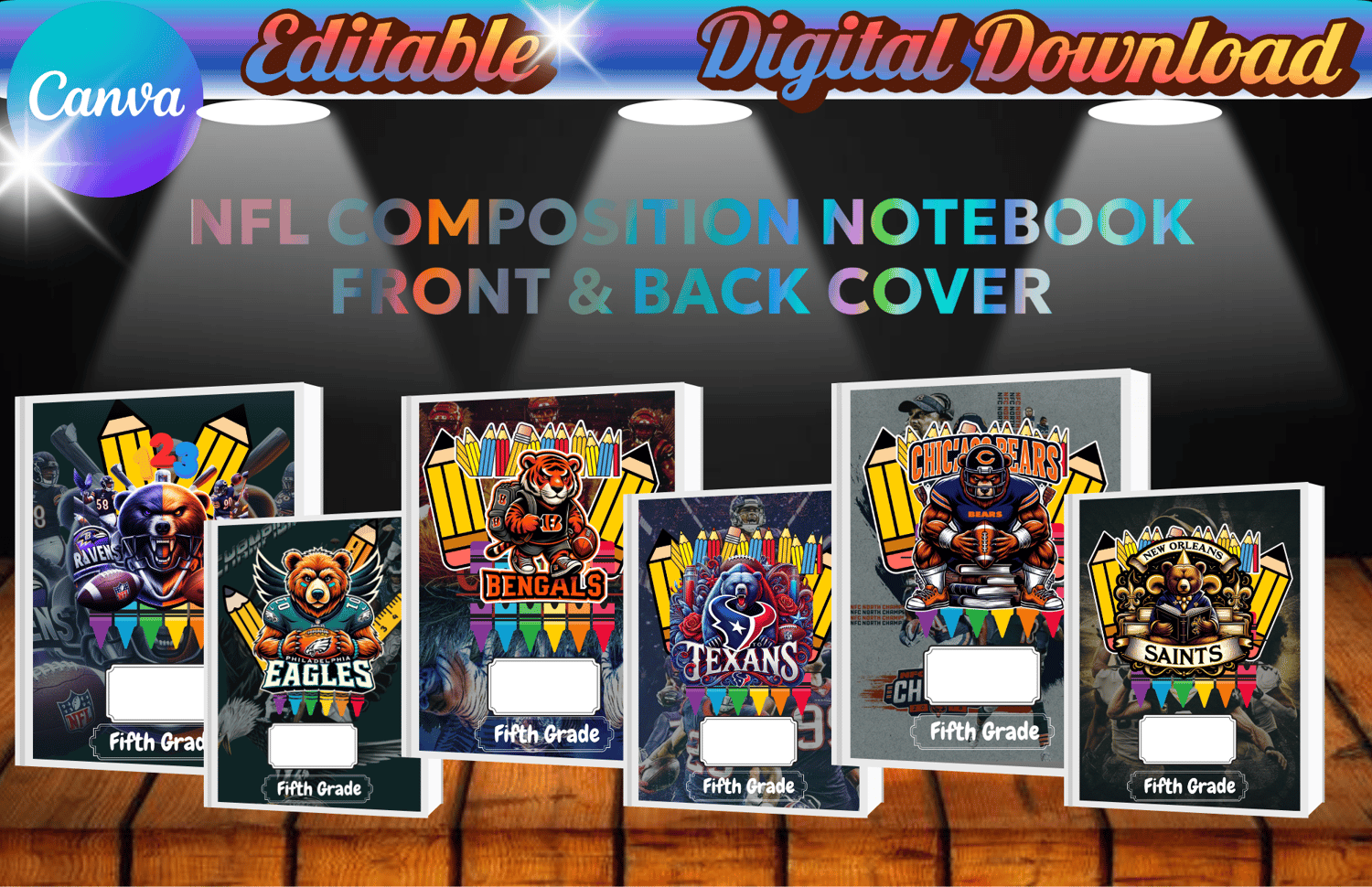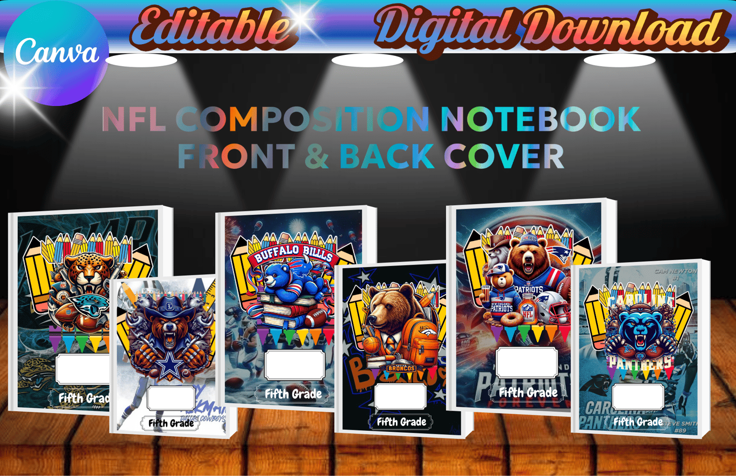 An NFL-themed composition notebook or book cover typically features bold, football-inspired designs that appeal to fans of the sport.These covers often showcase iconic imagery such as helmets, footballs, and team colors, sometimes incorporating patriotic elements like the American flag.The designs aim to capture the excitement and energy of the game, making them popular among students, athletes, and football enthusiasts