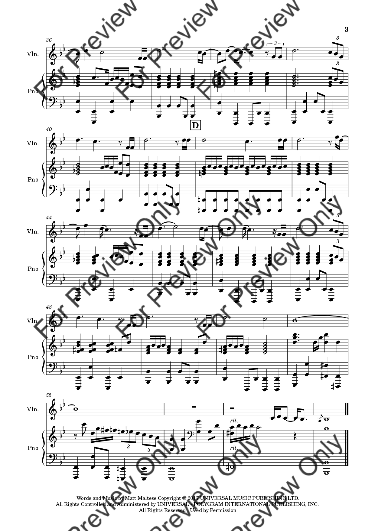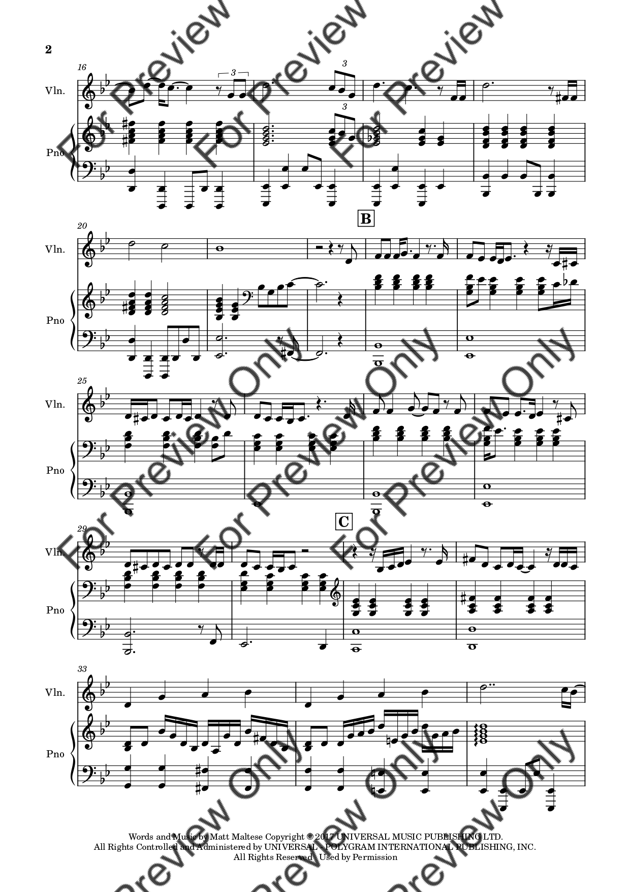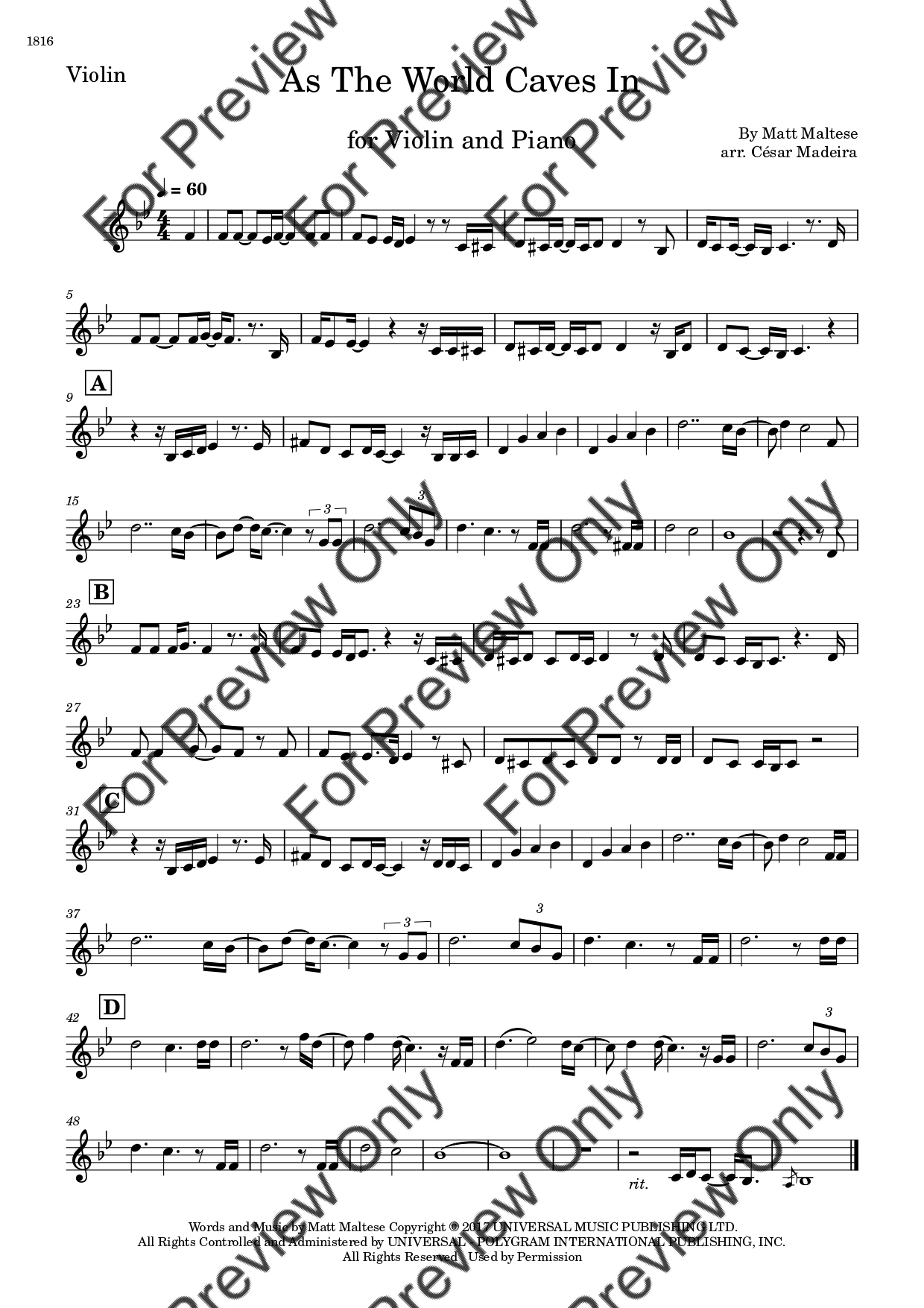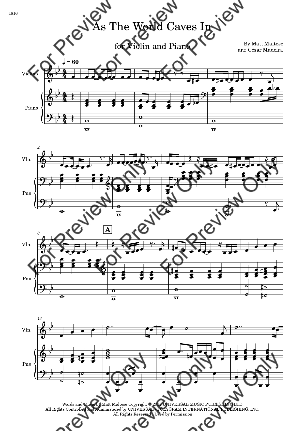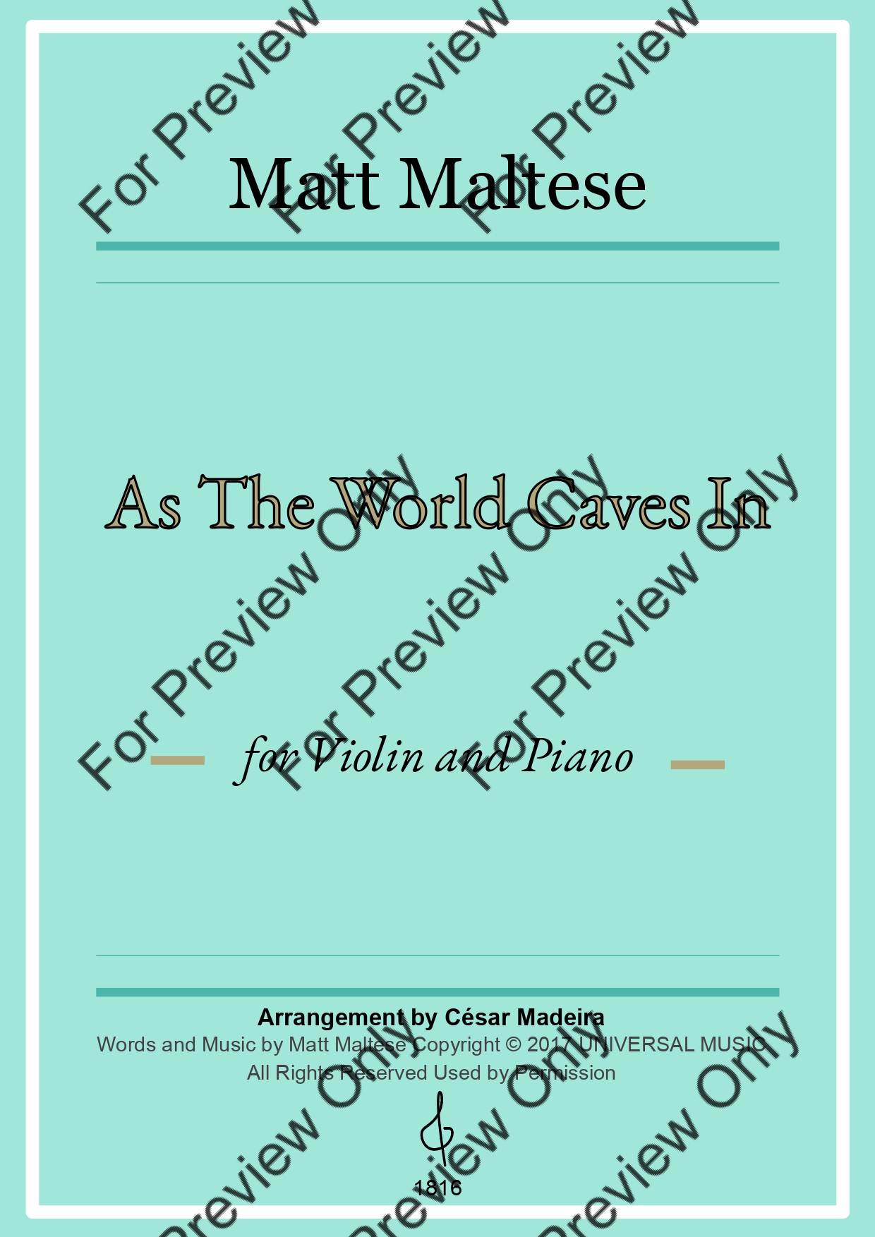 As The World Caves In by Matt Maltese. Arrangement for Violin and Piano. With Full Score and Individual Parts. Have fun!