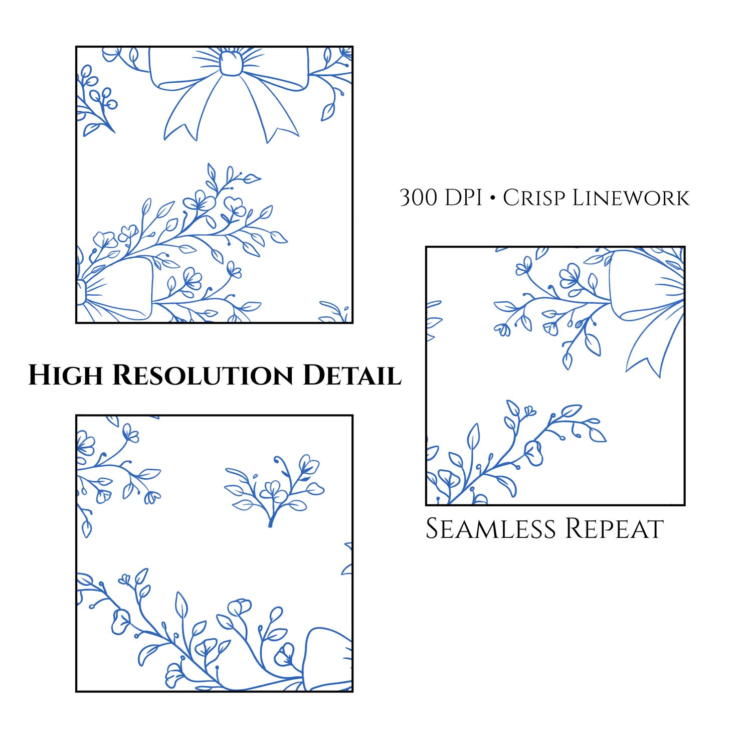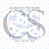 This beautifully detailed seamless pattern features delicate blue florals paired with dainty ribbon bows in a classic, toile-inspired layout. Designed with a clean white background and fine linework, this pattern brings a timeless, elegant feel to any project.