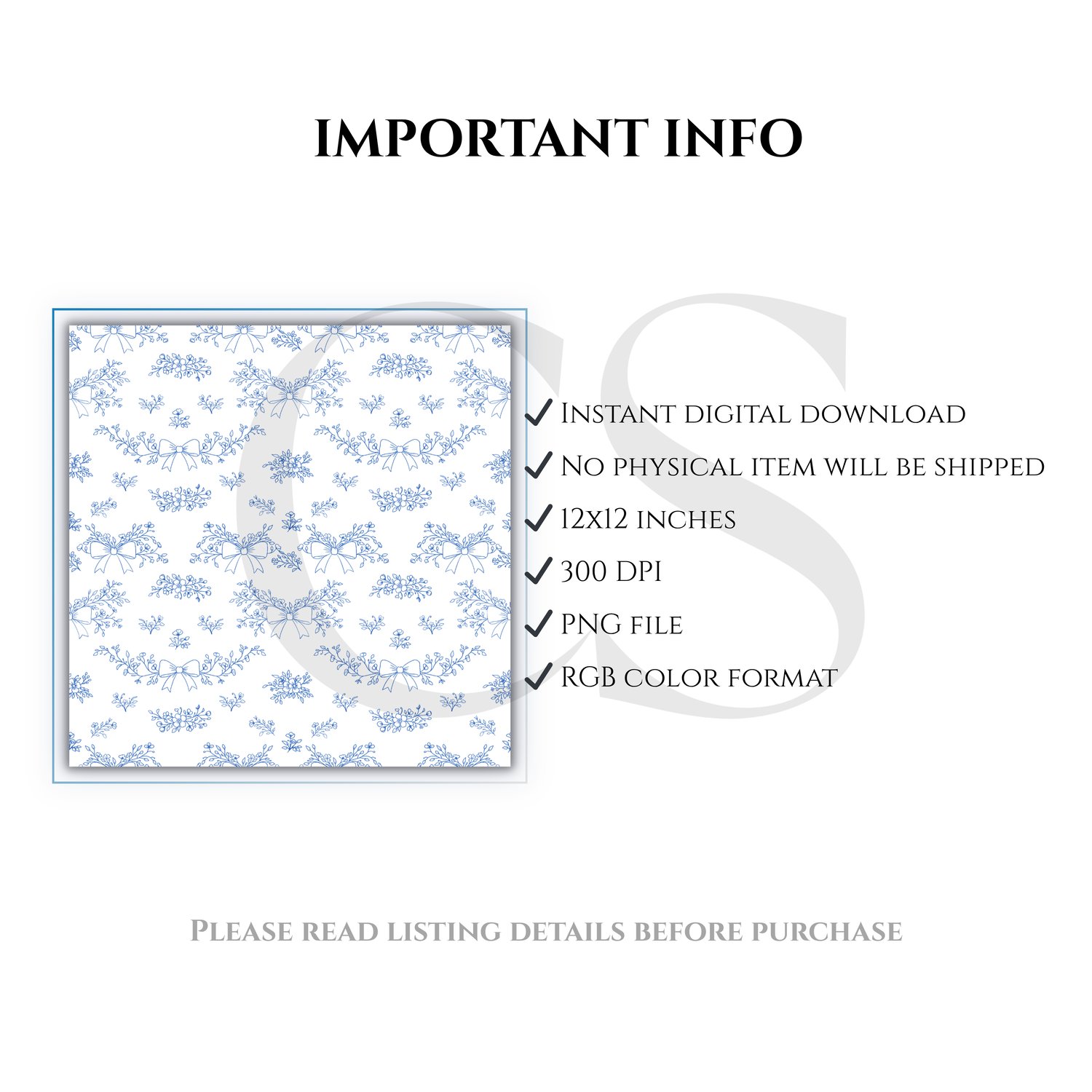 Blue Floral Bow Seamless Pattern PNG, Elegant Toile Style Pattern, Coquette Ribbon Design, 12x12 Digital Paper, Fabric Print
