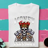 Make a bold statement with this "Money Equals Freedom" Skeleton PNG – a high-impact digital design featuring a crowned skeleton draped in jewels, flaunting stacks of cash, and dripping in royalty vibes. This edgy, urban-style artwork is perfect for creating standout t-shirts, hoodies, posters, sublimation projects, and more.