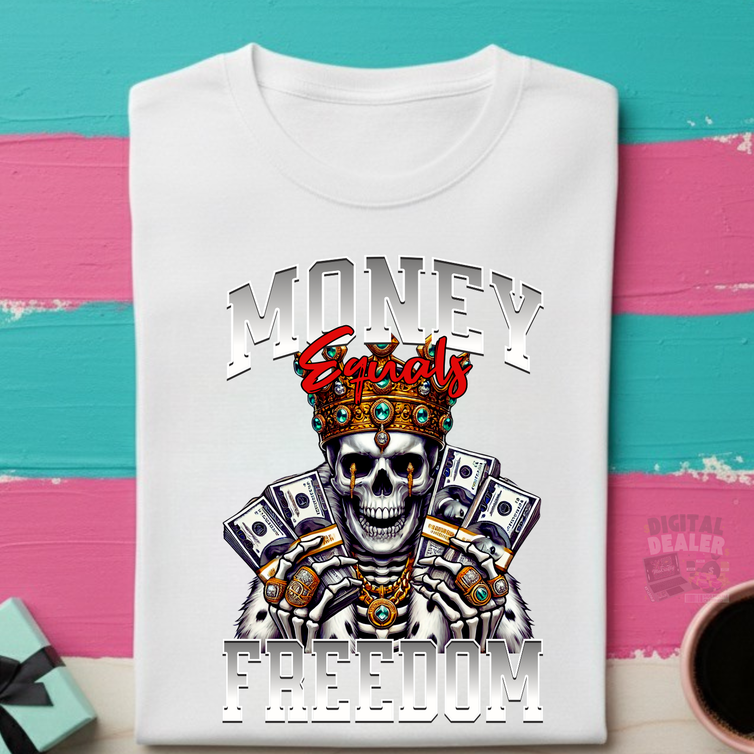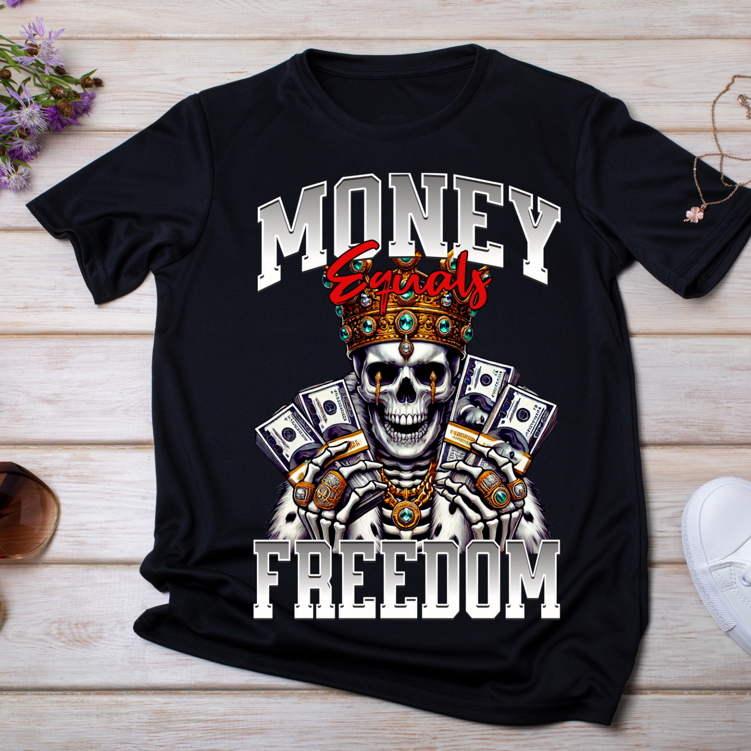 🔥 Add some hustle and royalty to your next project – grab your “Money Equals Freedom” skeleton design now and let your creativity cash out!