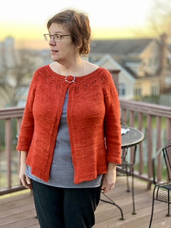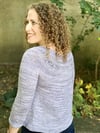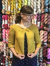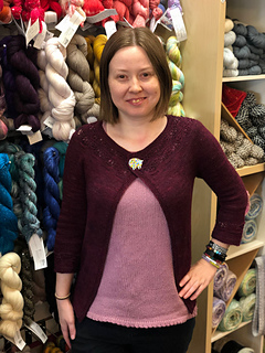 The cardigan is constructed from the top, down and knit back and forth. The sleeves are then picked up and knit from the top down. There is a delicate seed stitch collar and button band. There are optional short rows and you can make the sweater longer if you like. The sleeves are 3/4 sleeves and framed with a bit of lace which means you’ll have to focus for a bit right at the end. The button band has no buttons but you can certainly add them if you like.