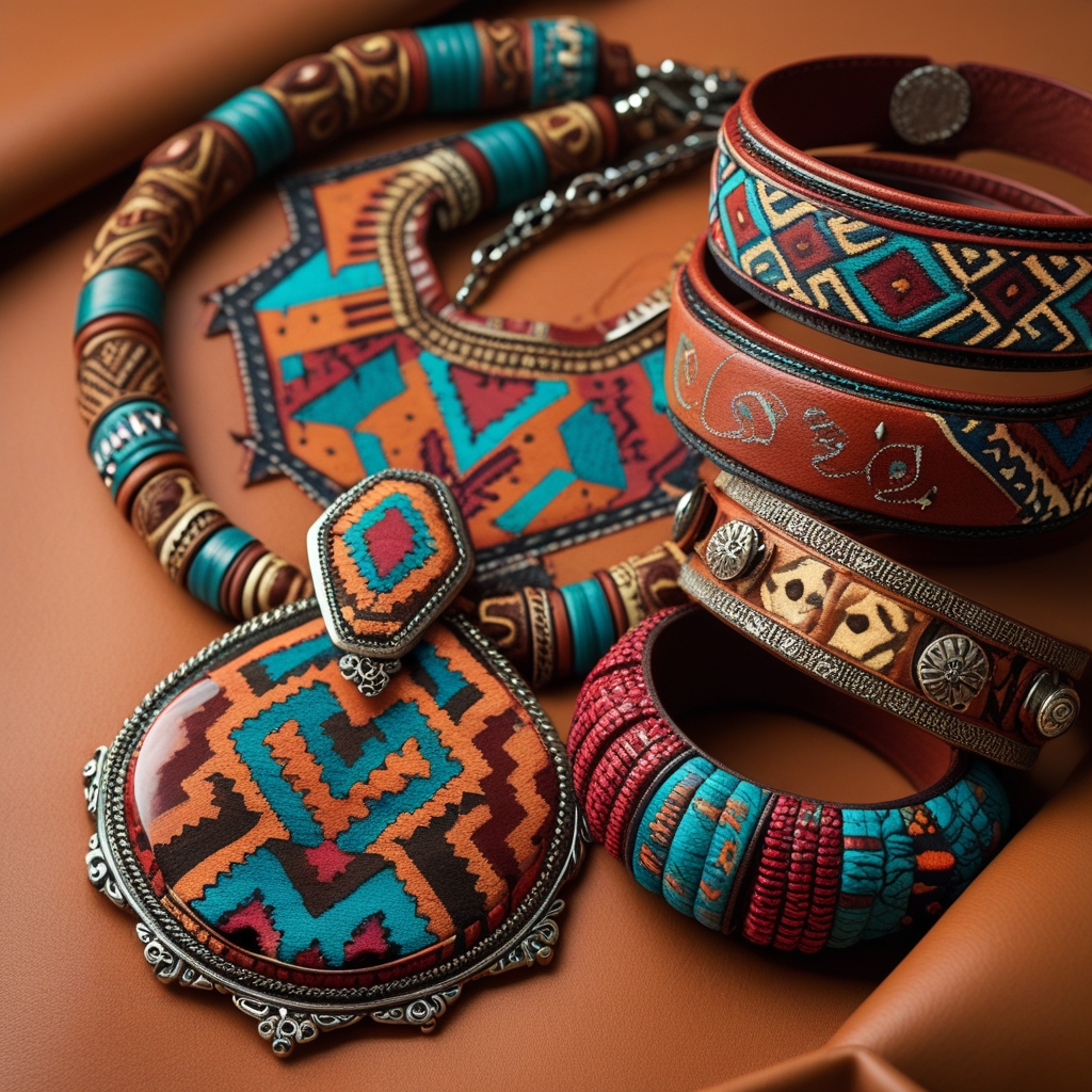 A jewelry design that combines traditional Anatolian Turkish ethnic kilim patterns and leather, featuring intricate geometric shapes and motifs in earthy tones such as terracotta, sienna, and umber, with accents of vibrant turquoise and crimson, set against a warm, natural leather background, with ornaments and embellishments that evoke a sense of cultural heritage and nostalgia, including a statement piece necklace with a large, ornate pendant and a series of stacked, chunky bangles, each one showcasing a unique kilim-inspired design element, such as stylized florals, scrolling vines, or tribal patterns, all meticulously rendered in a style that blends traditional craftsmanship with modern, edgy flair.