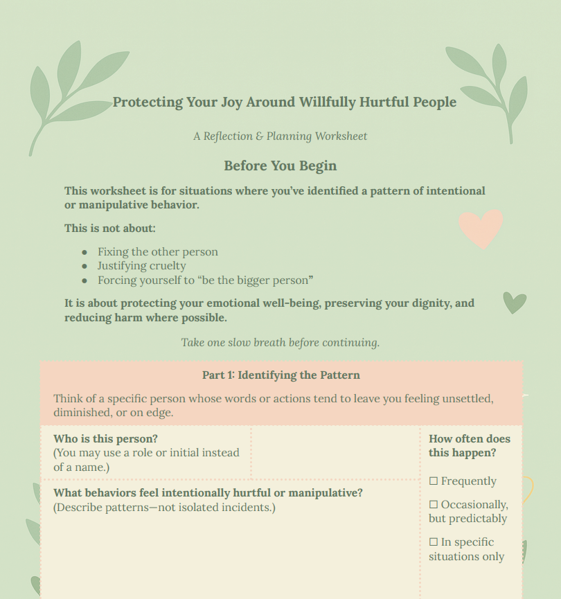 This guided worksheet is designed for moments when you’ve recognized repeated, willfully hurtful, or manipulative behavior and need a way to stay grounded without escalating conflict or abandoning yourself.