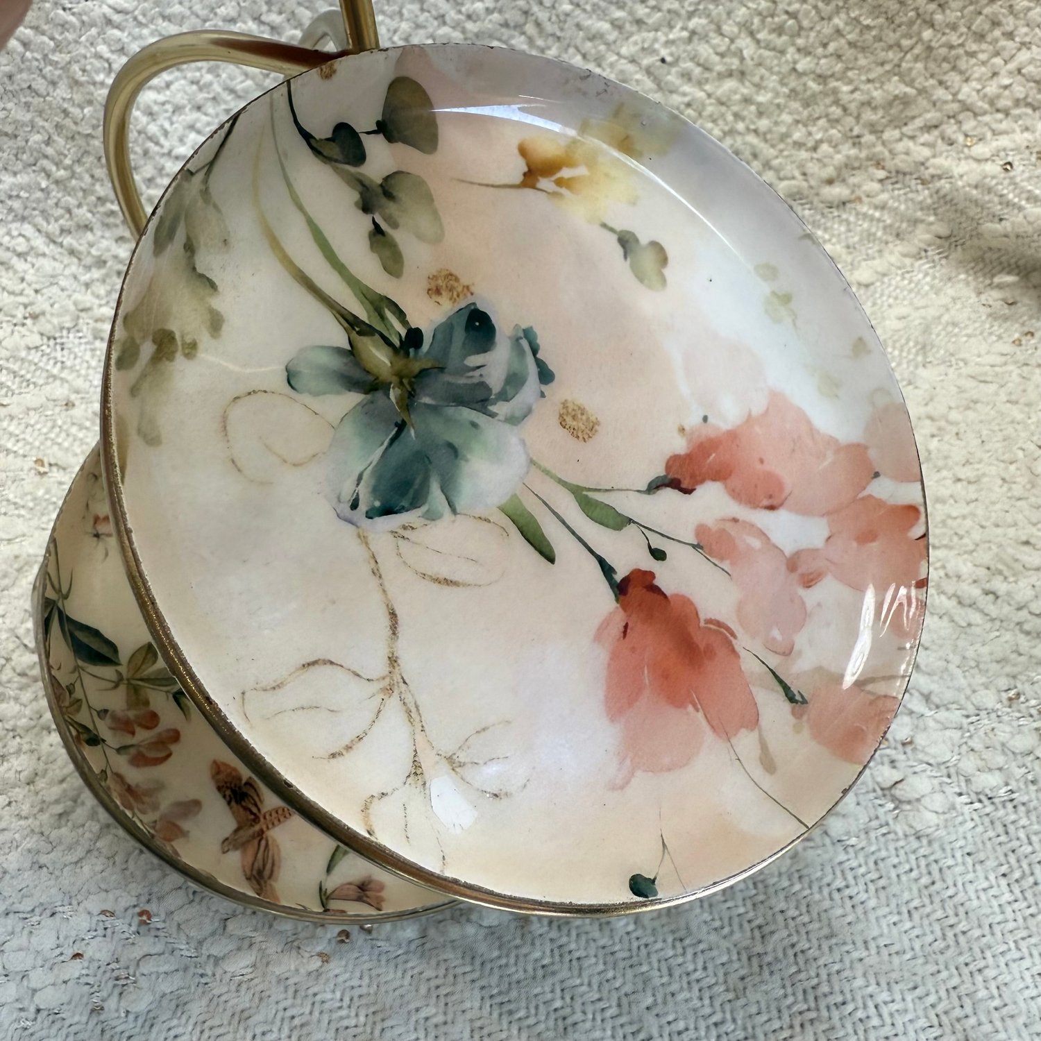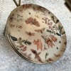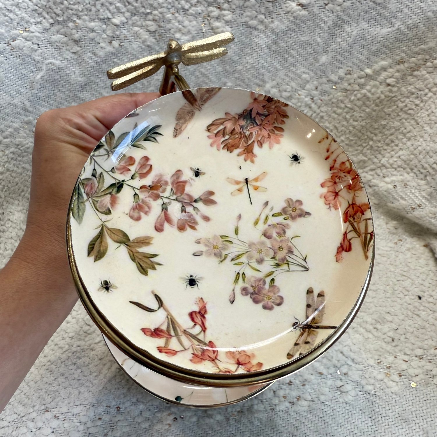 Brass 3 tier jewelry stand with a Dragonfly and pink and beige enamel and metal trays with flowers, bees, dragonflies, moths and more.