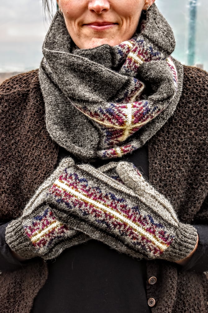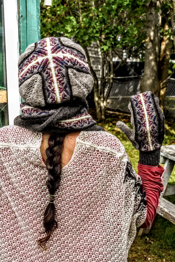 The second of five of the Noggin Cove Islands Collection, Noggin Cove are mostly sideways mittens featuring striking Fair Isle and a little panel of a traditional Shetland lace motif, Da Flee from wrist to thumb tip. Half of the Fair Isle is worked first, then stitches are picked up to work the remaining half. The sides of the hand are filled in and finished with the Modified 3-needle BO, then the thumb is worked in a unique construction from gusset to tip. The gusset is worked flat and transitions to working the thumb in the round. The mittens are finished with ribbing to desired cuff length. The pattern is written with a steeked option (Fair Isle in the round) and a non-steeked option (Fair Isle flat).