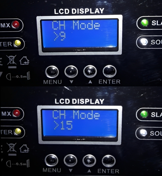 * Verifique en el display del equipo, que el menú "CH Mode" muestre los modos "9" y "15" (tercer foto).