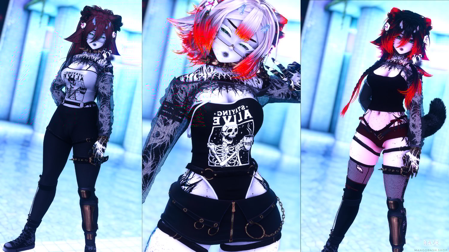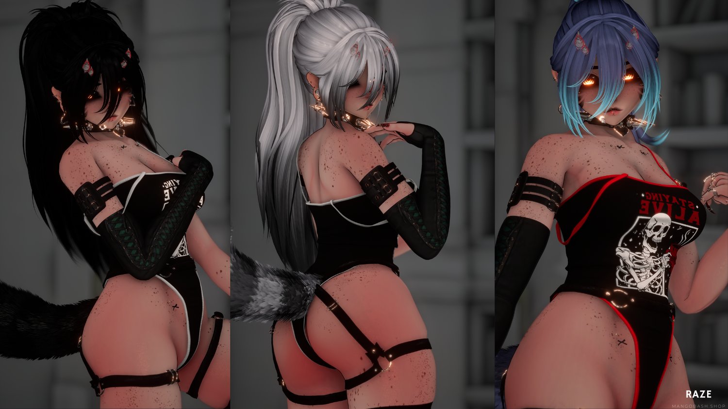 - Bottoms: Leggings, Skirt, Shorts, Sock, Ripped Fishnets and pantyhose decals* (the socks have a thigh squish blend shape);